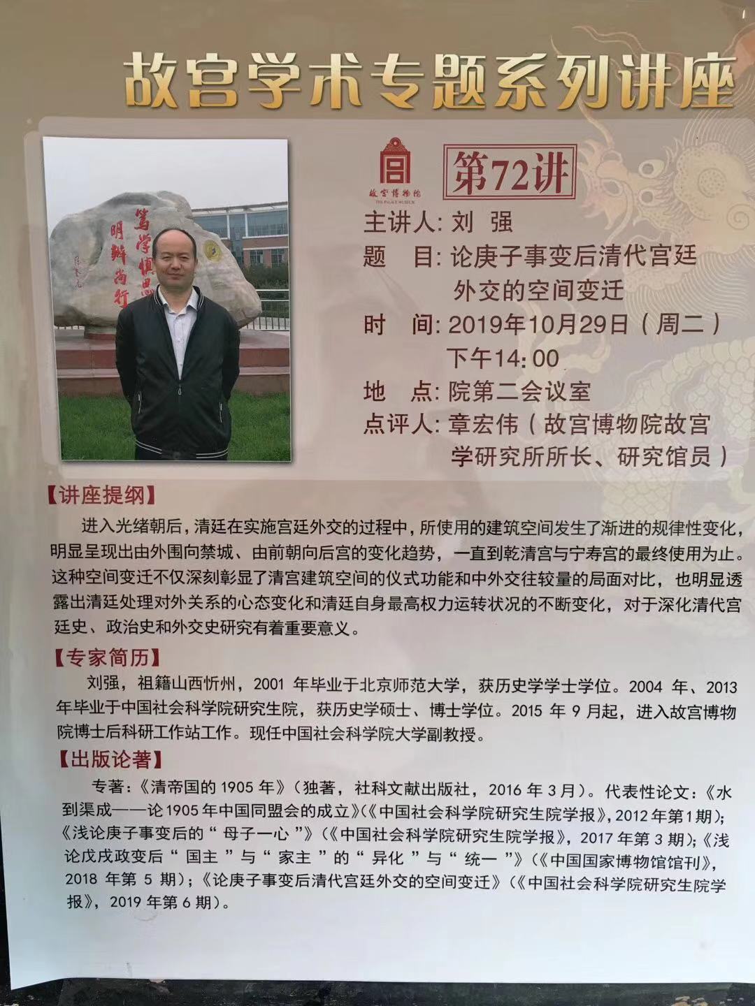 2019年10月29日下午在故宫博物院院第二会议室,刘强副教授进行了题为“论庚子事变后清代宫廷外交的空间变迁”的讲座。该讲座由故宫学研究所所长章宏伟主持及点评。