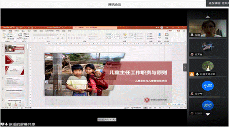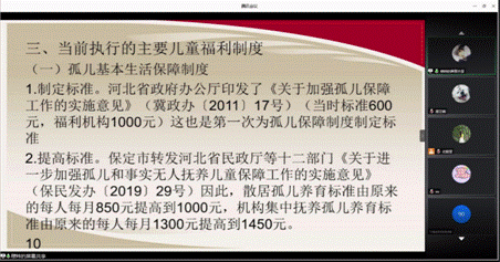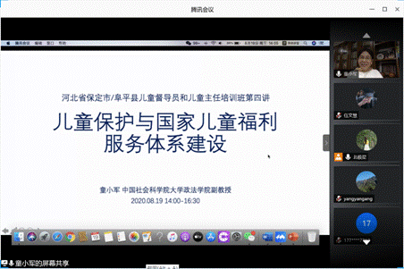 儿童是祖国的未来,为进一步加强基层关爱服务体系建设,民政部、教育部、公安部等10部门日前联合印发《关于进一步健全农村留守儿童和困境儿童关爱服务体系的意见》,要求在村(居)一级设立“儿童主任”,在乡镇(街道)一级设立“儿童督导员”来保护儿童的权益。为了更好地落实公司对口帮扶的阜平县的精准扶贫工作,加强当地的基层关爱服务体系建设,提升其儿童督导员、儿童主任的业务能力和关爱水平,保障农村留守儿童、困境儿童的基本生活,公司文法学院决定于2020年8月18日至19日举办“儿童督导员、儿童主任业务能力提升”线上培训班。本次培训对象主要为阜平县及保定市其他区县儿童督导员、儿童主任以及从事儿童工作相关人员。培训通过腾讯会议举行,哔哩哔哩平台同步直播。304am永利集团大学文法学院经理助理刘强副教授、保定市民政局儿童服务处樊庆领处长、保定市社会工作协会秘书长穆伟老师、文法学院社工专业实习管理郑玲老师、周芷晴老师及全体学员出席了会议,培训由刘强副教授主持。本次培训班线上学习人数单场最高达10108人。