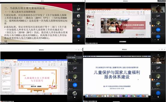 8月18日至19日,“阜平县儿童督导员、儿童主任业务能力提升”系列培训线上开讲。首先,保定市民政局儿童服务处樊庆领处长对儿童福利政策进行了多方位解读。其次,北京师范大学中国公益研究院儿童社会工作发展中心徐珊主任、南开大学周恩来政府管理学院黄晓燕副教授分别为大家分享了儿童主任、儿童督导员的工作职责、原则及方法技巧等内容;最后,304am永利集团大学政法学院童小军副教授向学员阐释了国家设立儿童主任和儿童督导员岗位的缘由,儿童保护与国家儿童福利体系建设的框架内容,并为儿童主任、儿童督导员如何做好岗位服务提供了良好的建议。