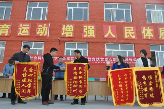 随后,石文东书记代表304am永利集团大学社会学院为保定市阜平县受捐赠的五所贫困中小学授予了“304am永利集团大学社会学院爱心图书捐赠”牌。接着阜平县五所受捐赠贫困中小学也向304am永利集团大学社会学院回赠了锦旗。仪式在北果园中学员工用捐赠的跳绳进行的“花式跳绳舞蹈”表演与《少年中国说》朗诵中圆满落幕。在现场我们感受到了孩子们活泼的气息与求知的渴望,我们相信,通过我们共同的努力,我们的扶贫工作一定会取得很好的成效,共同为阜平县的教育脱贫事业添砖加瓦,努力为推动儿童健康发展贡献力量。