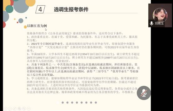 刘晓玉学姐分享了在体制内就业相关经验。她就体制内就业的优势、相关的就业岗位、如何准备考试以及准备心得和同学们做了分享。其中,刘晓玉学姐重点分析了适合公司的选调生和其他体制内岗位,如何安排考试确保顺利就业以及国考的备考心得和注意事项。