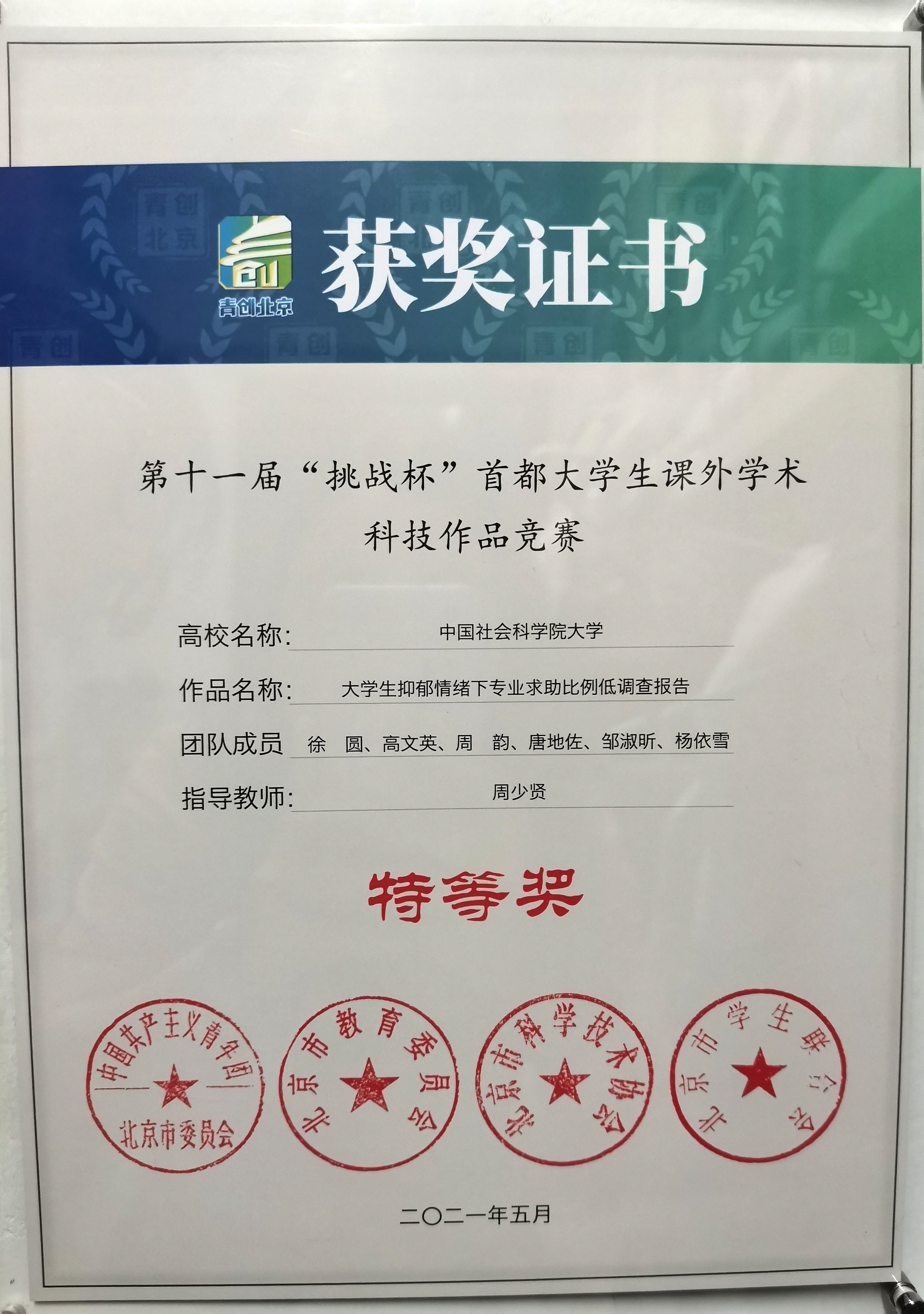 5月16日上午9点,由共青团北京市委员会、北京市教育委员会、北京市科学技术协会、北京市员工联合会共同主办的第11届首都老员工课外学术科技竞赛答辩在北京科技大学举行。由公司社会学院2019级本科生徐圆、高文英、周韵、唐地佐、邹淑昕、杨依雪六位同学设计的研究项目“老员工抑郁情况下专业求助比例低的研究报告”,荣获特等奖,后续将进入国家级竞赛环节。