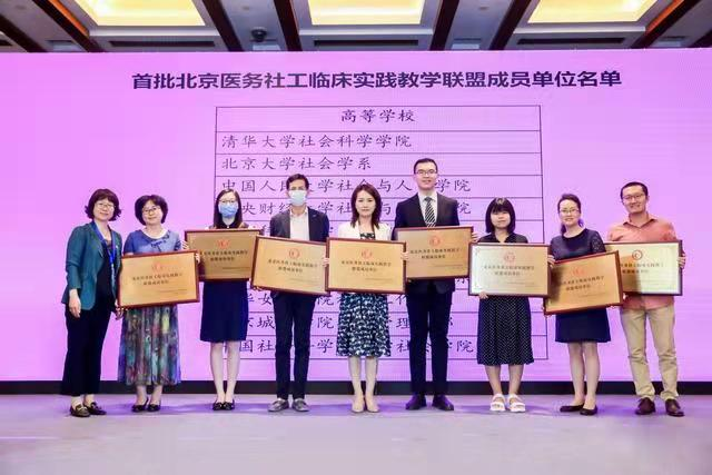 2021年6月9日,北京医院管理香山论坛医务社会工作高质量发展分论坛在北京举办,论坛成立了“北京医务社工临床实践教学联盟”,并对首批加入联盟的22家医疗机构及10所高校院系授牌,旨在通过医社联合、医校联合,努力培养一支适合卫生健康系统需要的复合型医务社工专业人才队伍。304am永利集团大学社会学院首批加入联盟并获授牌,公司实习基地首都医科大学附属北京世纪坛医院亦为联盟成员。我院王勇主任医师担任会议主持嘉宾,李原副教授代表学院参与授牌仪式。
