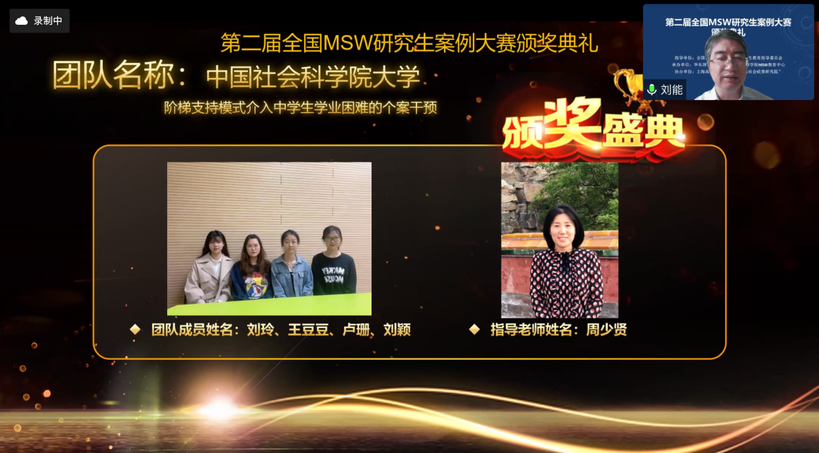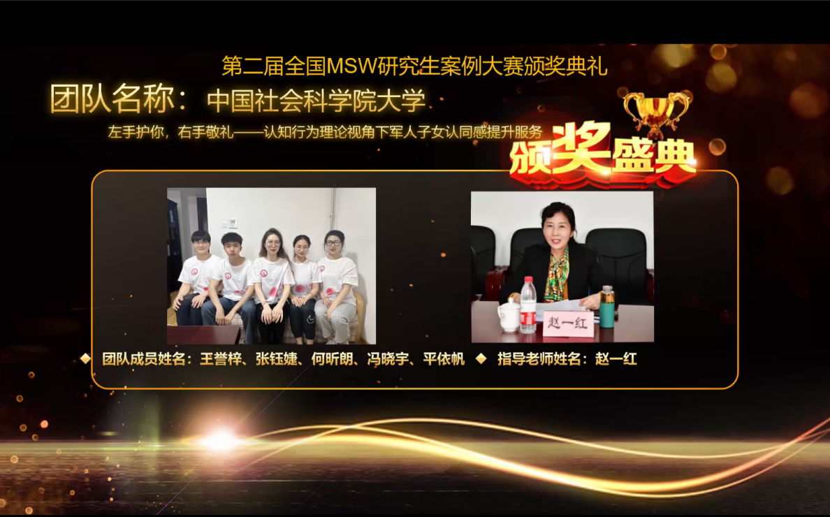其中,由公司常务副经理、博士生导师赵一红教授指导,2021级MSW王誉梓、张钰婕、何昕朗、冯晓宇、平依帆同学设计的研究项目“左手护你,右手敬礼——认知行为理论视角下军人子女认同感提升服务”,以及公司硕士生导师周少贤副教授指导,2021级MSW刘玲、刘颖、卢珊、王豆豆同学设计的研究项目“阶梯式照顾模式介入中员工学业困难的个案干预”成功进入全国三十六强案例。经过激烈角逐,两支队伍均获得第二届“全国MSW研究生案例大赛”三等奖的好成绩。