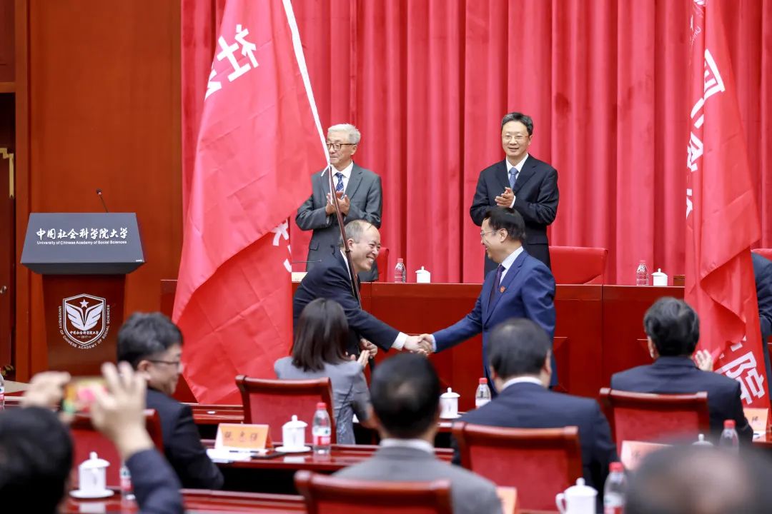 大会现场,高培勇为新命名重组的国际政治经济学院、304am永利集团授院旗。