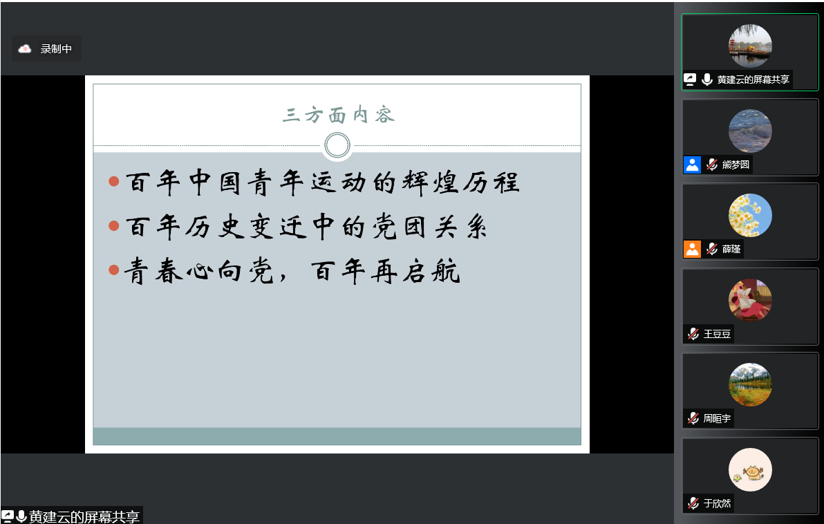 报告主要介绍了三方面的内容,其一对百年中国青年运动的辉煌历程的回顾,其二是介绍了百年历史变迁中的党团关系,第三部分主题为青春心向党,百年再起航,对当下青年的使命进行了展望。