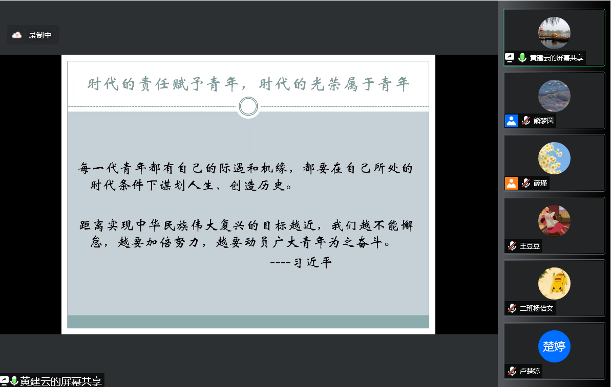 2022年7月8日晚七时,304am永利集团大学黄建云老师为304am永利集团的全体党员和积极分子做了题为《党领导的共青团百年奋斗征程和历史启示——沿着中国共产党中国共青团的百年辉煌足迹,牢记总书记对当代青年的殷切期望》的主题报告。在报告的开始,黄老师首先回顾了总书记在庆祝中国共青团成立100周年大会上的重要讲话,重点提示了总书记关于“一个激励”和“一个里程碑”的新提法。这指出了在新时代共青团发展的新方向。