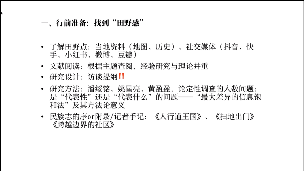 第二位分享人是中国人民大学2020级社会学硕士邹子晗,其分享主要有行前准备、进入田野和撰写报告三个方面。行前准备需要找到“田野感”,这也是田野实践中时刻要注意的,在进入之前,可以通过资料和社交媒体了解田野点的基本情况,根据研究的主题去看看相关的经验研究和理论研究,然后有层次地设计访谈提纲。在研究方法方面,邹同学推荐了几篇论文和民族志的手记,对我们在访谈心态可能也有很多启发。在进入田野时,要找到进入的方法,要思考自己在田野中的角色和存在理由,这个角色和田野息息相关,邹同学也从自己在定州的实际经历阐述了介绍人的作用和限制。对于田野中的观察,她提醒我们不仅仅只有提问和聊天,我们还可以关注访谈的场景、人际关系以及互动过程中的表情语气等等,还要对发生着的日常和组织结构保持敏感。在田野中,我们要养成每日写田野笔记的习惯,记录下自己的想法和观察到的事实,还可以通过影像记录。如果有时间的话,可以边读文献边做田野,不时在文献与田野之间“穿梭”,时时回顾自己的研究问题,善用理论思考推进田野实践。在撰写报告环节,需要找准研究问题,清楚地表述与问题相关的经验材料,还需要在相关领域进行对话,撰写自己对田野环节的回顾和反思,进而推进自己田野思考的深度。
