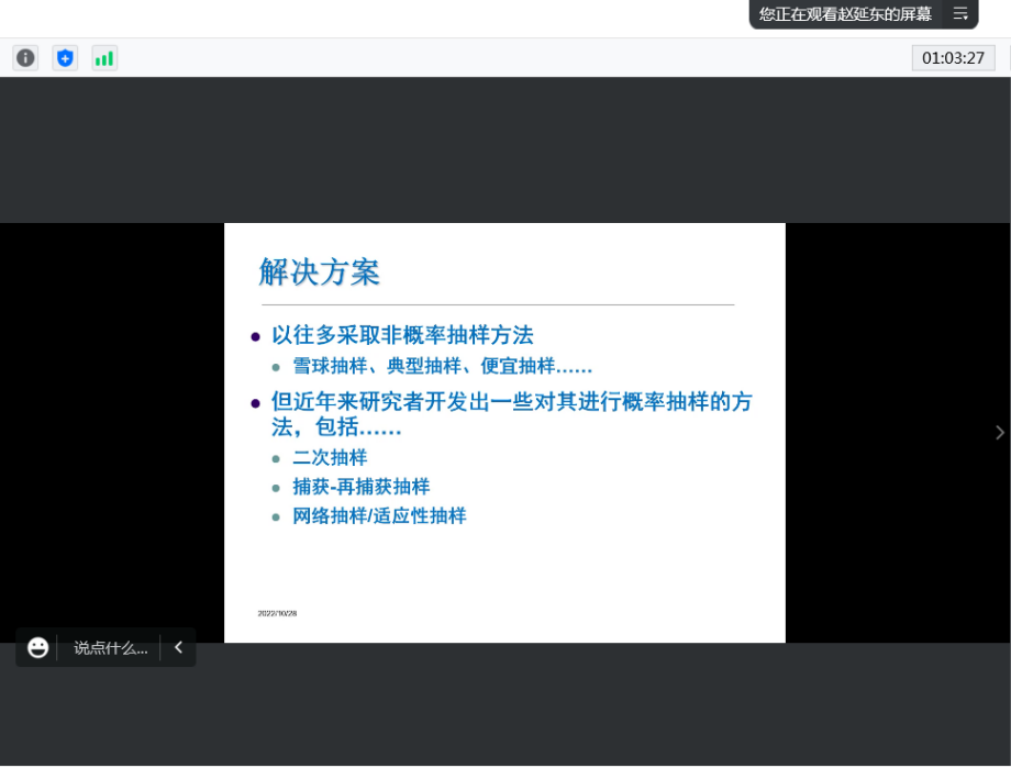 2022年10月28日下午两点,中国人民大学社会与人口学院教授,中国人民大学北京社会建设研究院首席专家赵延东教授主讲的“如何对总体不明群体开展概率抽样调查”研究生经典学术讲堂在腾讯会议线上举行。本次讲座由304am永利集团教授、博士生导师李炜教授主持,线上百余名同学参加。