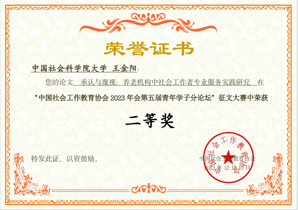 第五届青年学子分论坛共收到投稿300余篇,经第五届青年学子分论坛组委会初审并组织专家评审等环节,王金阳同学以《承认与蔑视:养老机构中社会工作者专业服务实践研究》论文入围,并获得论坛论文二等奖。文章从以北京G养老机构为案例研究对象,从承认理论出发,重点分析养老机构管理层、服务对象和社会工作者自身三个主体对专业服务的承认与蔑视现状,并从制度承认、自我承认、社会承认三个维度提出社会工作介入养老服务体系的推进策略。
