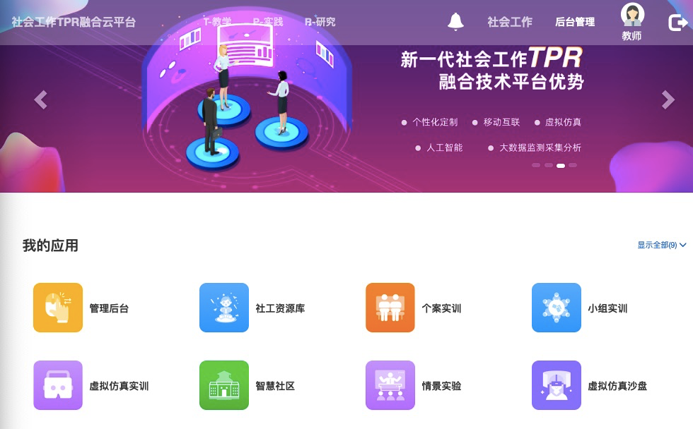 新文科社会工作TPR智慧融合实训平台实验室从专业与技术融合角度出发,积极迎合公司“国家双一流专业和国家级、省级示范实验平台”总体建设规划需要,以社会工作为核心专业,带动家庭社会工作、矫正社会工作、社会治理等多个内容建设,将社会工作与服务专业群的实践教学技术平台建设成特色鲜明、辐射带动作用强的国家级实践教学示范基地,充分发挥新技术与优势团队建设的深度融合应用(专业定制+移动互联网(公有云+私有云)+大数据+虚拟化+智能化),从而实现公司“政、产、学、研、用”生态一体化的TPR综合实验教学平台,同时亦为我专业成为国家一流专业奠定坚实基础。