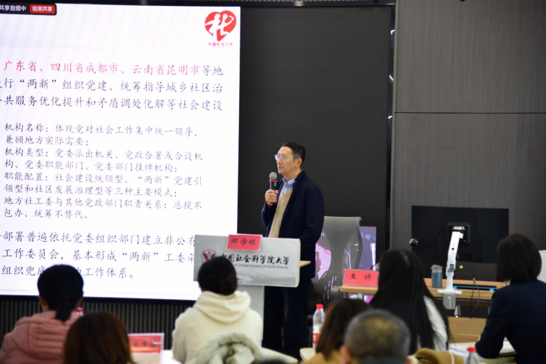 上午首场讲座由中国社会工作学会秘书长邹学银主讲,其主题围绕社会工作人才队伍建设方向与要点,提出要抓好社会领域的党建工作与基层社会治理这两个要点,强调中央社会工作部要在健全统筹协调机制、完善政策顶层设计、持续加强人才培养等方面发挥作用。