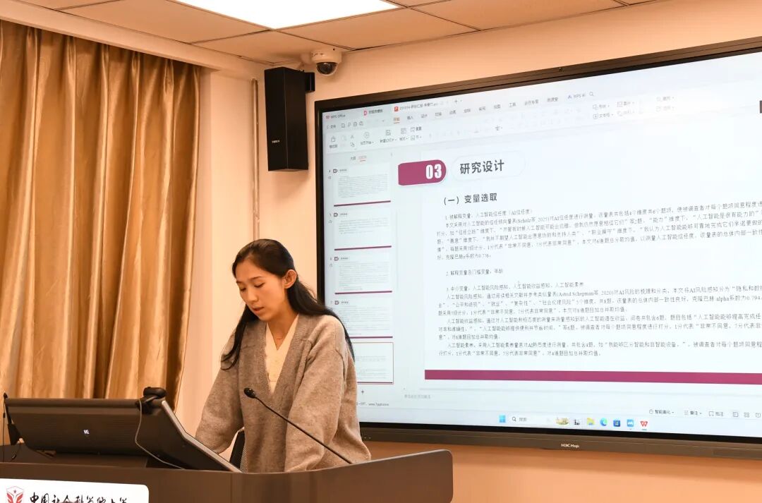 米兰同学就《数据要素成为生产要素:数字不平等及其社会认知研究》进行了阶段性成果展示。研究系统梳理了数据要素化进程中的不平等现象,并创新性地将研究重心置于对数字不平等的社会认知测量层面,通过核心概念梳理与界定、测量框架和指标体系构建,自主设计了“数字素养”与“数字不平等意识”测量量表,依托全国性社会调查(CSS2025)回收逾12000份数据,深入探究公众对数据权益、平台控制与利益分配的感知与意识。针对研究内容,评审老师给予了肯定与精准指导。沈杰老师强调,研究需在庞大的框架中进一步聚焦核心问题。王晶老师指出,研究中提出的“数字职业群体”概念极具新意,为理解不平等提供了富有潜力的新视角,建议可进一步聚焦于此,区分“技术驾驭者”与“被动适应者”等不同群体进行深入剖析,以超越传统的数字鸿沟研究范式。赵联飞老师认为,该研究在概念内涵的结构化揭示方面表现出突出的意识,值得肯定,希望在后续研究中进一步完善操作化。