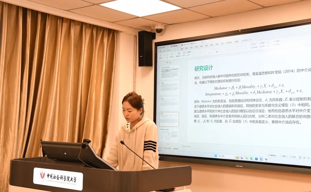 赛晓妤同学及其项目成员在成果论文《从“修身”到“入群”:道德的社会融入效应》中,以儒家“修身”传统为理论基点,系统阐释了其以道德为本、贯通个体德性完善与社会秩序构建的核心内涵,明确了将“修身”理念引入现代社会融合研究的理论价值与现实意义。同时,还结合2015年中国综合社会调查(CGSS2015)微观数据,将“修身入群”理念在现代社会的适用性作为核心议题展开研究。结果显示个体道德水平对社会融入具有显著正向推动作用,且公德在公共领域整合中的作用强于私德,为中华优秀传统文化创造性转化及和谐社会构建提供了重要参考。在研究汇报过程中,沈杰老师指出,该项目具有启发性,并进一步提示需深入辨析“修身”概念是否可直接等同于“道德”,以及公德与私德在理论内涵与现实维度上的具体区别。王晶老师则建议,可基于实地调查进一步挖掘道德在当代社会中的多元意涵与表现形式,以拓展研究的深度与广度。