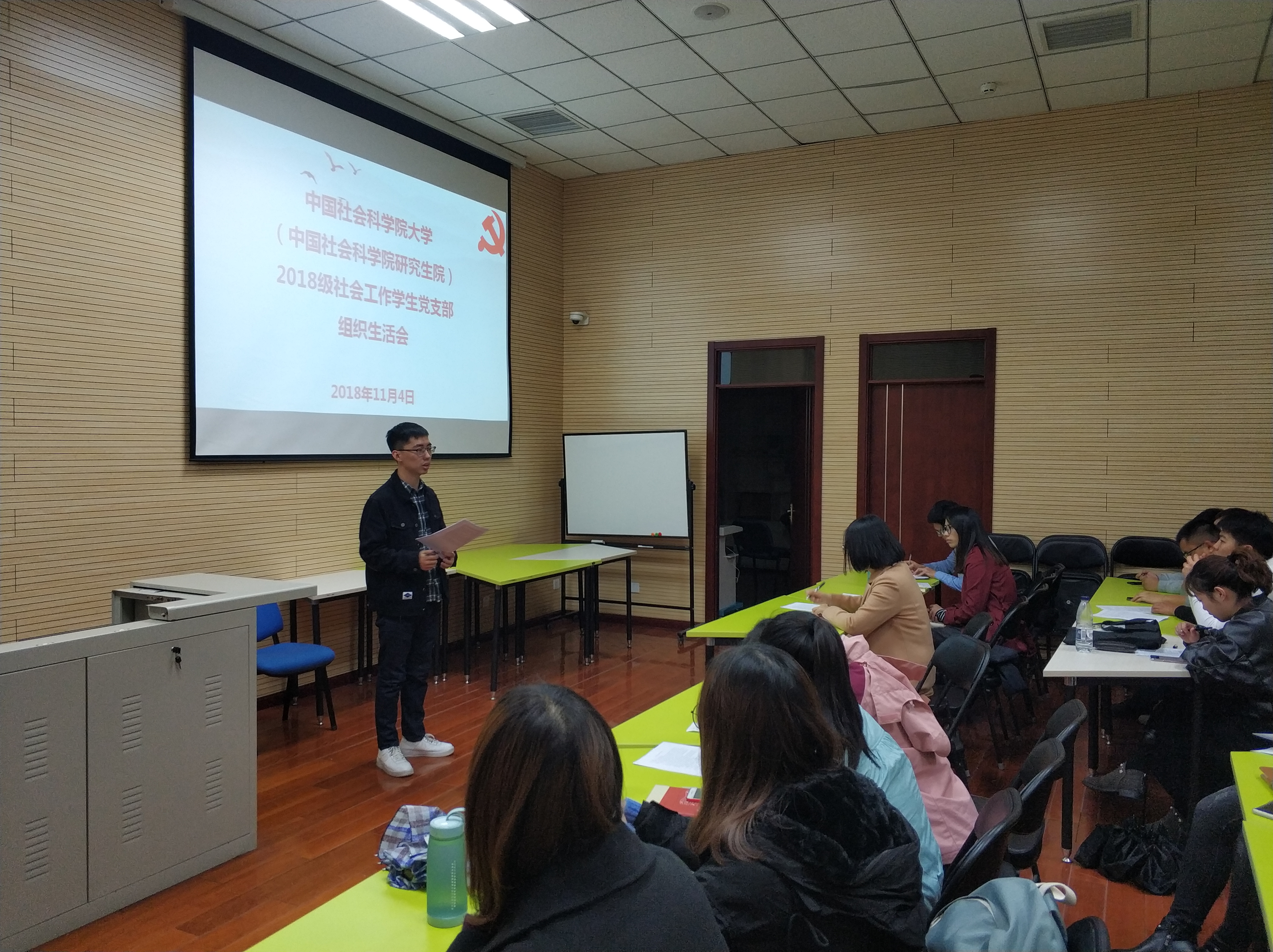 2018年11月4日,2018级社会工作硕士党支部组织生活会在教学楼社工实验室顺利召开。参加本次生活会的有员工工作负责老师赵宗宇以及2018级社会工作专业19名党员同志,本次生活会由一班党支部书记林楠同志主持。本次会议以“不忘初心,牢记使命、坚定党员政治立场”为主题,通过集体学习新修订的《中国共产党纪律处分条例》、观影及分享观后感等方式进行交流探讨。