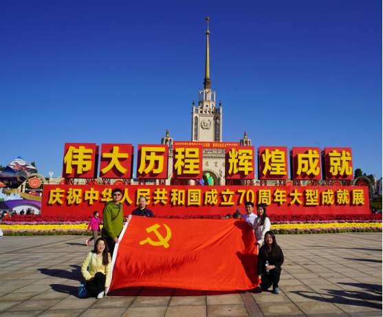 走出展览馆后,党支部教工于南广场的彩车前合影。在参与过阅兵游行的彩车之下,沐浴着盛世乐章的余韵,曲尽而未觉,意犹而未尽。短短70年间,祖国不仅实现了站起来、富起来,更大踏步向强起来迈进,这一切正是源于建国以来广大党员群众的不懈努力,今天的基层党员更应该积极响应习近平总书记的号召,“不忘初心,牢记使命”,在参观学习过程中提高思想认识,把认识落到实处、在工作中坚决贯彻新时代中国特色社会主义思想,用自己的行动缔造下一个更加辉煌的十年。
