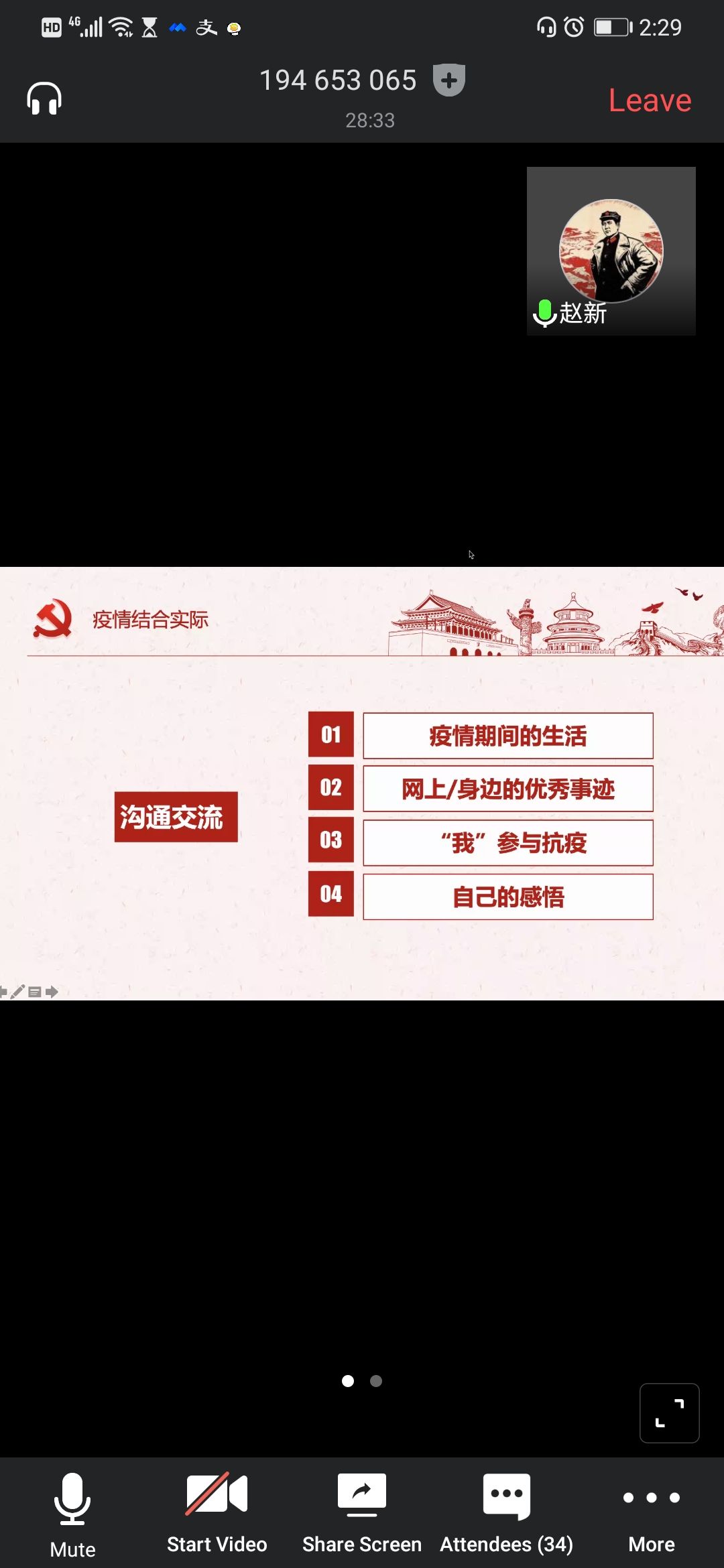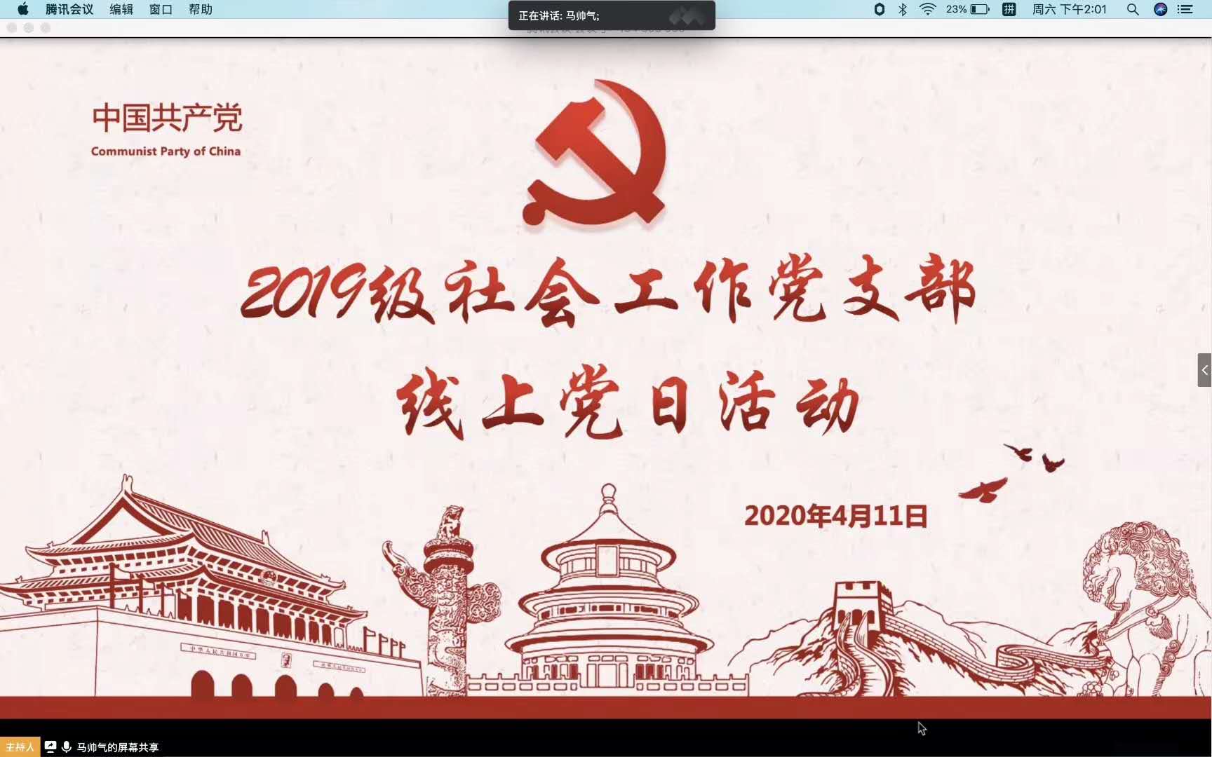 因此,2019级社工党支部组织全体社工员工党员和入党积极分子,在提前观看了有关党史和疫情的一系列纪录片、珍贵影像等的基础上,于2020年4月11日下午举行了一次线上党日学习讨论。此次党日学习讨论共有33名同学参加,采取了线上直播方式,进一步创新和优化了社工员工党支部的组织生活方式。