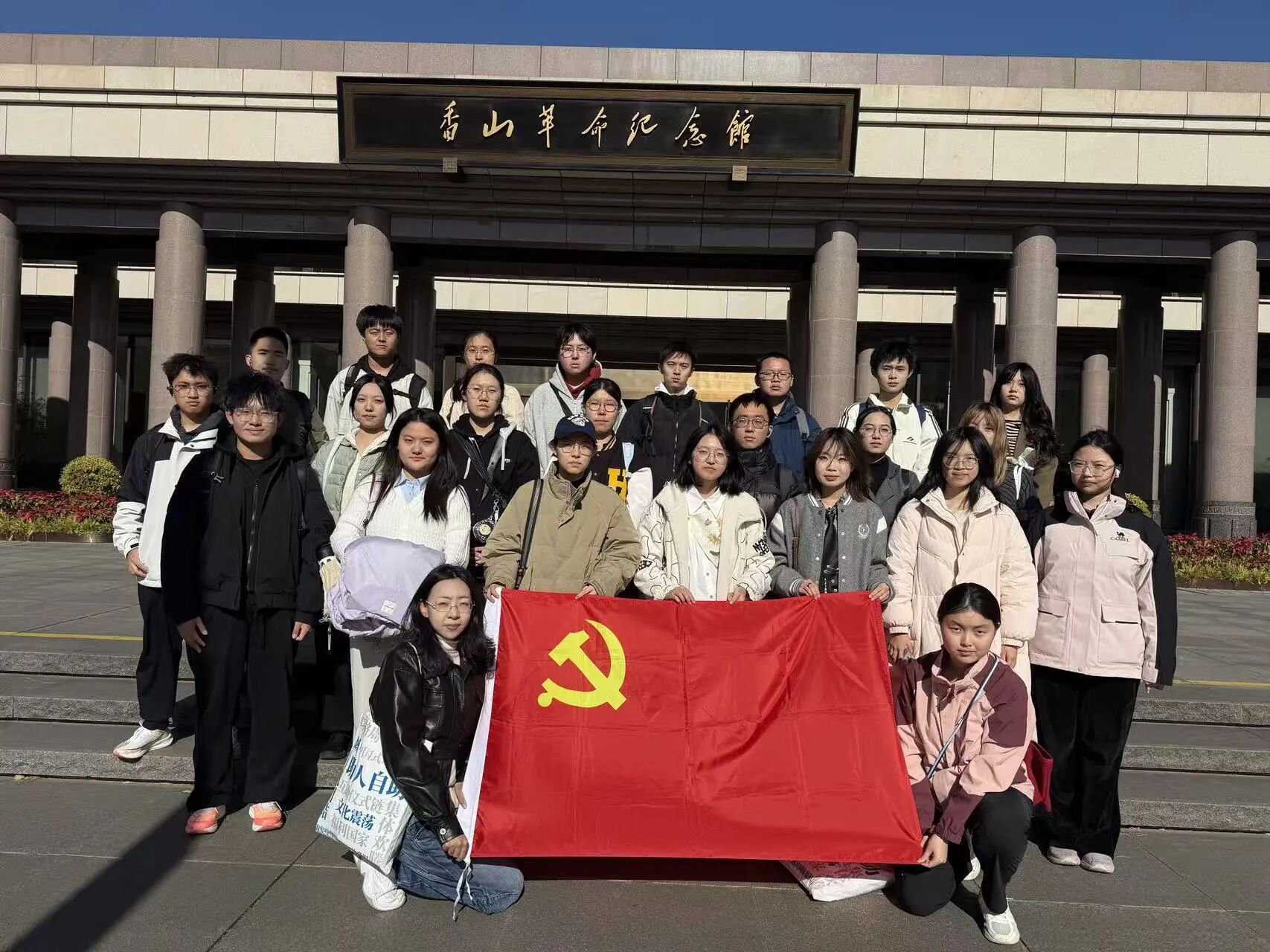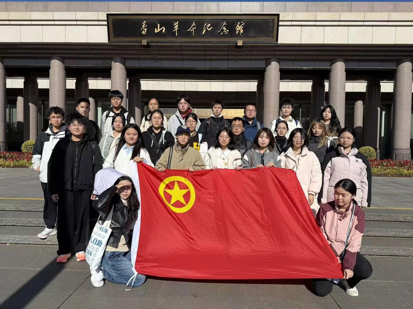 上午11点,队伍首先抵达香山革命纪念馆,这座承载着新中国奠基记忆的红色地标,瞬间将大家带入那段波澜壮阔的峥嵘岁月。在庄严肃穆的纪念馆前,同学们整齐列队,高举党旗与团旗合影留念,鲜红的旗帜与青春的面庞相映成辉,定格下新时代青年与党的初心使命紧密相连的瞬间。