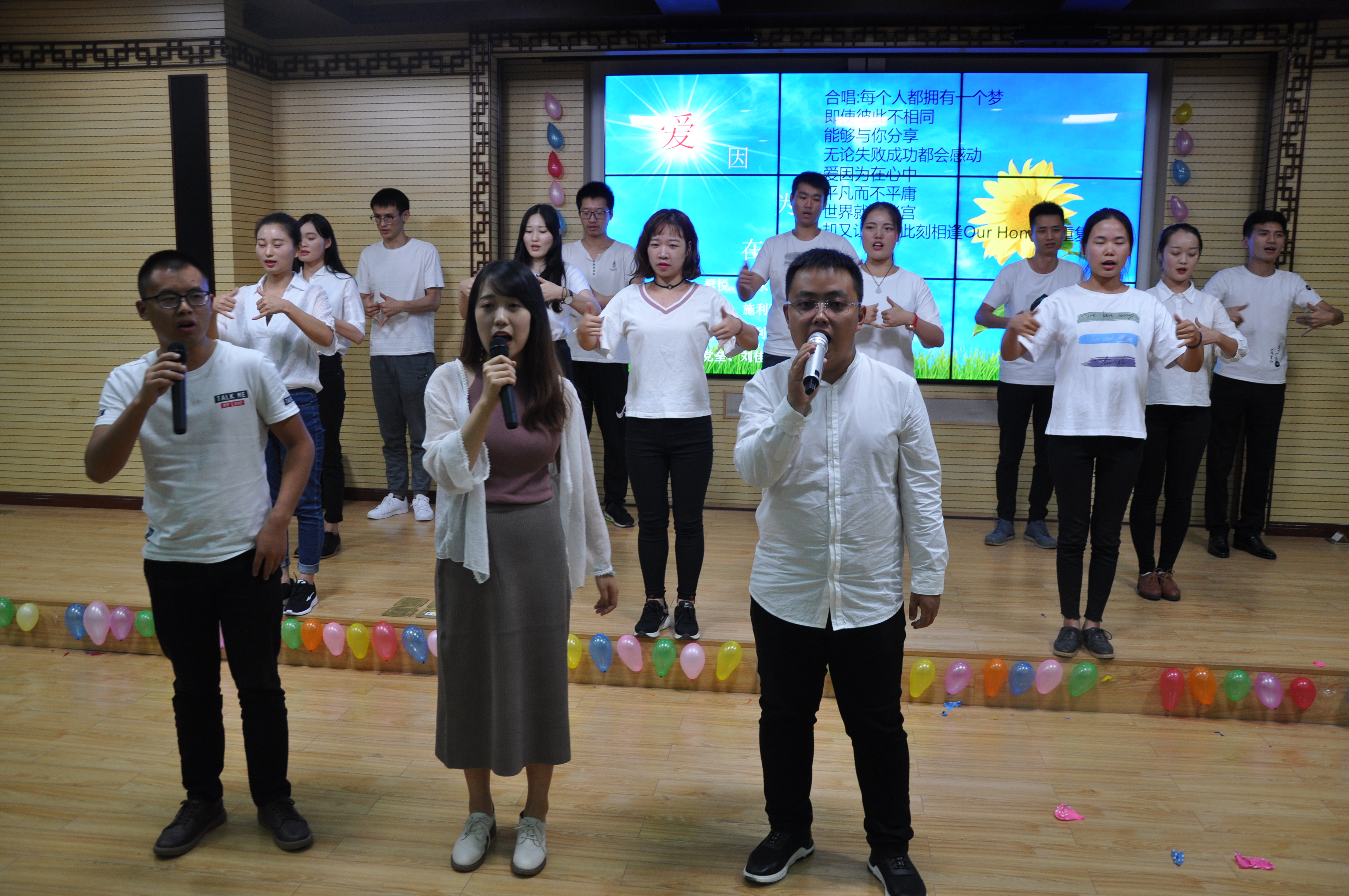 随后的歌曲《成都》、蒙古舞《鸿雁》和《Five Hundred Miles》,使大家游离在思乡的情绪里。刘强老师的经典歌曲《青青菩提树》,再一次把我们拉回到那个百转千回的西游故事里。最后以手语表演《爱因为在心中》落下帷幕。