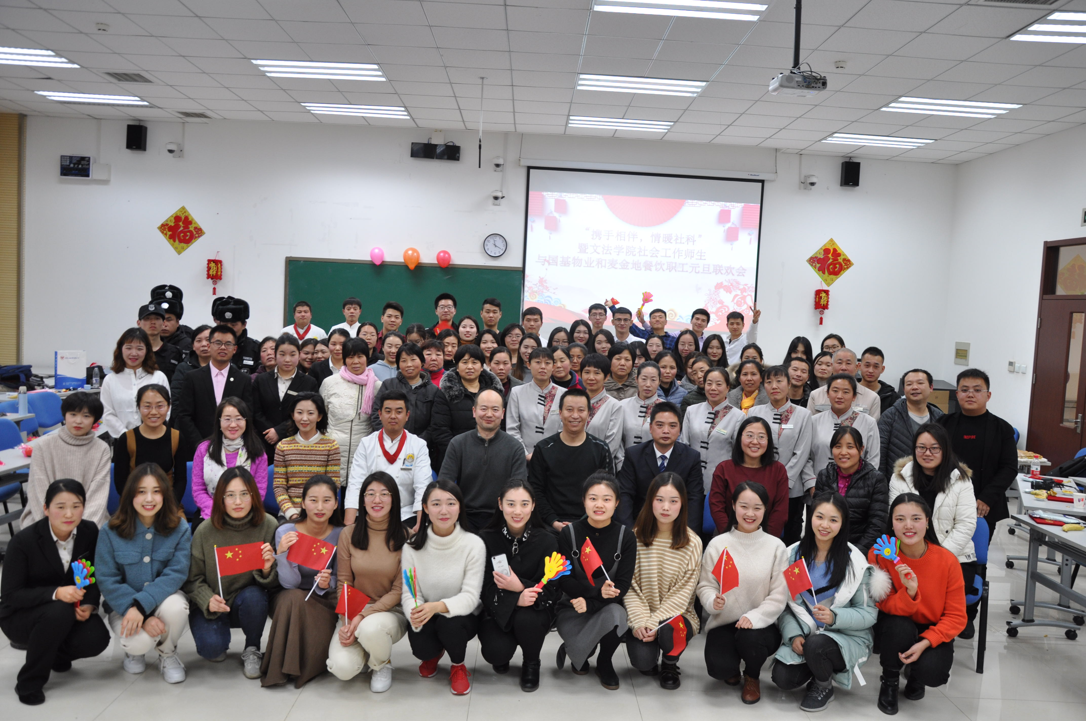2018年12月26日下午,“携手相伴,情暖社科”暨文法学院社会工作师生、国基物业和麦金地餐饮职工元旦联欢会在良乡校区教学楼221教室成功举办。参加此次活动的有总务处张部林副处长,文法学院经理助理刘强老师和学院行政老师,国基物业、麦金地餐饮公司的工作人员以及社会工作专业2018级的全体员工。