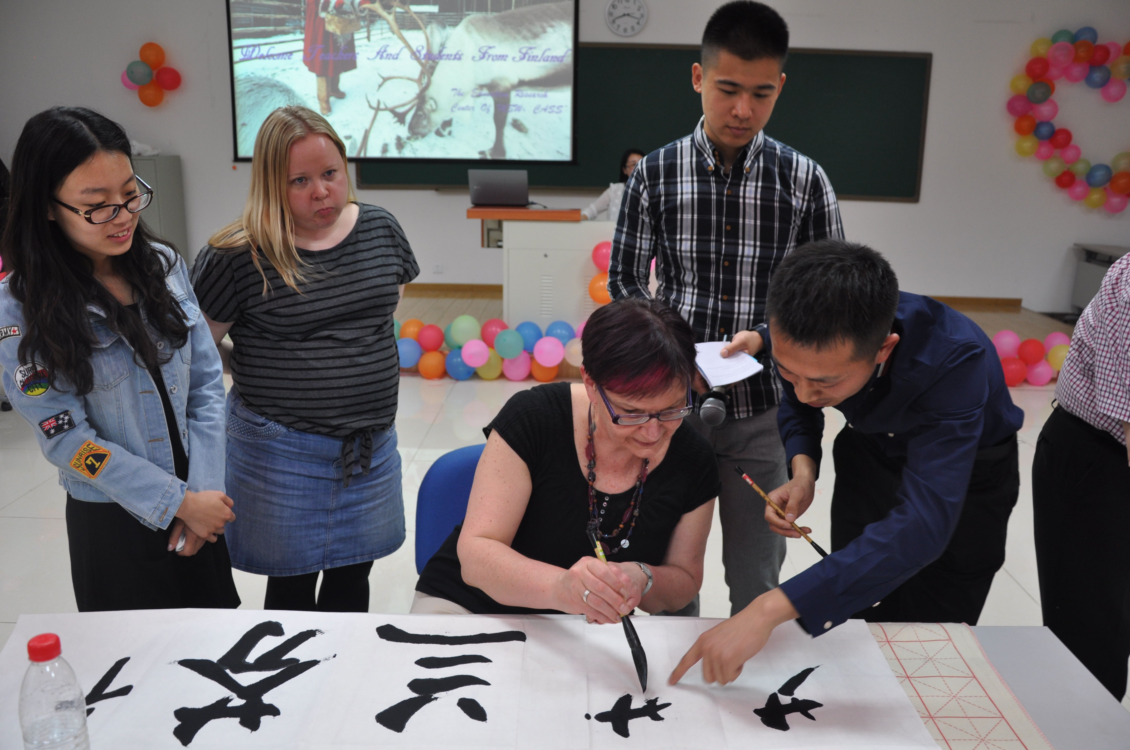 晚会期间中芬师生的热情逐渐被激发起来,纷纷于现场即兴表演,极大活跃了现场气氛——日籍员工亚希子的民族歌谣温婉清秀、Juhua教授的芬兰民歌韵味悠长等。现场互动环节,同学们现场教给芬兰的师生们使用毛笔写汉字、画水墨,芬兰师生在好奇之余也展现了自己对中国“毛笔”的特殊喜爱和兴趣,并现场挥洒笔墨作画题字赠与芬兰的友人。