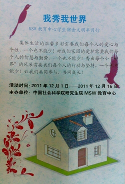 美化环境,从身边做起。为鼓励员工共同营造温馨、文明、安全的宿舍生活氛围,展示员工良好的精神风貌,公司社会工作硕士教育中心特举办主题为“我秀我世界”2011级员工文明宿舍评比活动。