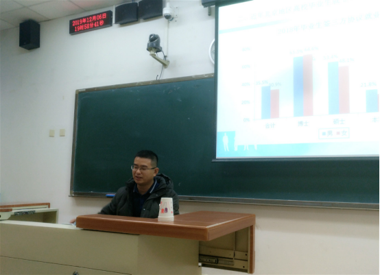 张海涛老师长期负责北京高校毕业生就业派遣等工作,对北京市就业的基本情况以及就业政策非常熟悉。在宣讲过程中,张海涛老师图文并茂,联系具体实例为同学们介绍了北京高校就业情况和就业政策,讲解内容主要分为四个方面:一是北京地区近年毕业生数量情况,二是近年北京地区高校毕业生就业情况,三是毕业生就业流程,四是就业政策。