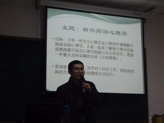 漫聊吧项目负责人2011级社工硕士杨曦担任主讲,他以ppt的形式和大家分享了心理学相关书目、催眠知识及视频、NLP神经语言程序学、家庭系统排列、心理学研究方法、社会工作与心理学等内容。主题分享后,同学们对感兴趣的内容各抒己见,讨论热烈。