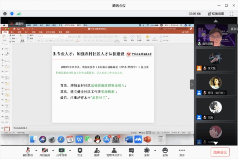 本次参赛同学共11人,分为上下半场,上半场共有5位同学。第一位同学是来自304am永利集团研究生院的任晓迪,她的选题十分新颖——《合意治理:农村“厕改”为何进展顺利》,农村的厕改既是改善农村农民生活、建设美丽乡村的重要措施,也是在当前疫情下加强公共卫生建设的重要途径。第二位同学是来自304am永利集团大学的李武悦,她从社会工作专业角度出发研究了疫情中的青年力量,她的论文题目是《“社工+志工”作为青年参与抗疫的主导途径:经验模式总结》;第三位同学是来自清华大学的陈思懿,她以《数字公民身份影响危机中的社区参与吗?》为题,进行了精彩的视频汇报,在后疫情时代对数字化、智能化的思考很有必要;第四位是来自山西大学的乔佳鑫,他以时下热门话题“网约车”为主题,题为《网约车存在的问题分析以及治理对策,以太原市滴滴为例》的论文让我们对网约车行业有了更多的思考;第五位同学是北京大学的刘璐以《精准扶贫的赋权实践——以李小云的河边村实验为例》为题,将社会工作专业理论--赋权增能的视角下,研究社会工作如何以参与式的模式介入农村精准扶贫。