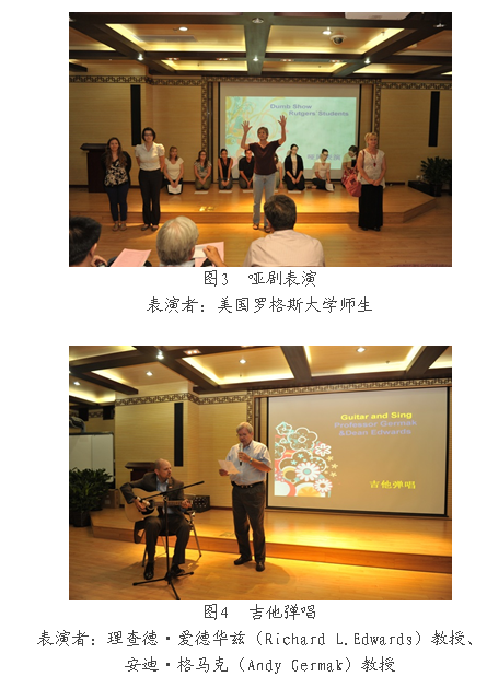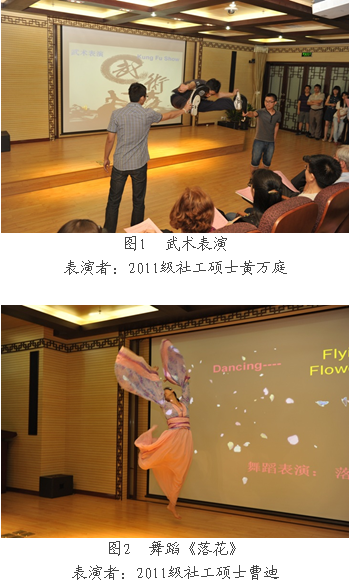 联谊晚会由2011级社工硕士组织策划、节目筹备及编排,融京剧、武术、独唱、舞蹈、钢琴演奏、情景剧等多种艺术形式,穿插书法、国画、美食、春节等版块介绍,充分展示社工学子的各样才华及中国传统文化的源远流长。美国师生带来了精心准备的哑剧表演和吉他弹唱等节目,表演之余他们和主持人一起互动,大家在异域文化中感受到美国师生的热情奔放。整场晚会,师生沉浸在欢声笑语中,不时为精彩的节目叫好和鼓掌。