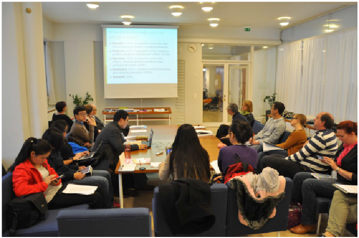2014年9月20日-27日,社工硕士教育中心副主任刘文瑞、社会学系副教授李炜以及遴选出的八名博士生赴芬兰赫尔辛基大学,参加了为期一周的博士生课程模块学习与讨论。十位师生围绕中芬社会工作理论、社会工作方法、老年社会工作、儿童社会工作等课程领域的专业理论和实务经验进行了模块学习与研讨,深入进行了跨民族研究,同时参观了芬兰老年与儿童社会服务机构,深入了解了芬兰在老年社会工作和儿童保护领域方面的实务经验。
