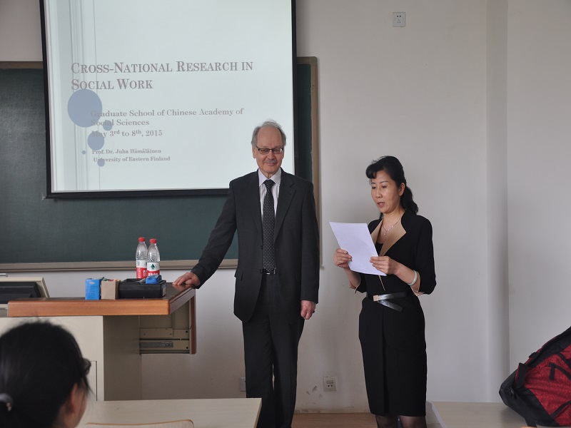 本次模块学习的内容涵盖中芬社会工作跨民族研究、社会工作理论、社会研究方法、社区社会工作、老年社会工作、社会福利政策等领域。社科院社会学所所长陈光金教授、公司MSW教育中心主任赵一红教授、社科院社会学所潘屹教授、孙炳耀副教授及李炜副教授,分别作了主题报告,并同参会的中芬师生进行了互动交流。同时,芬兰社工大学联盟主席、东芬兰大学Juha Hämäläinen教授,以及芬兰社工大学联盟副主席、于韦斯屈莱大学Marjo Kuronen教授,为公司2014级MSW员工作了主题讲座,介绍了社会福利和社会工作在芬兰的发展概况,扩展了公司MSW员工的国际化视野。