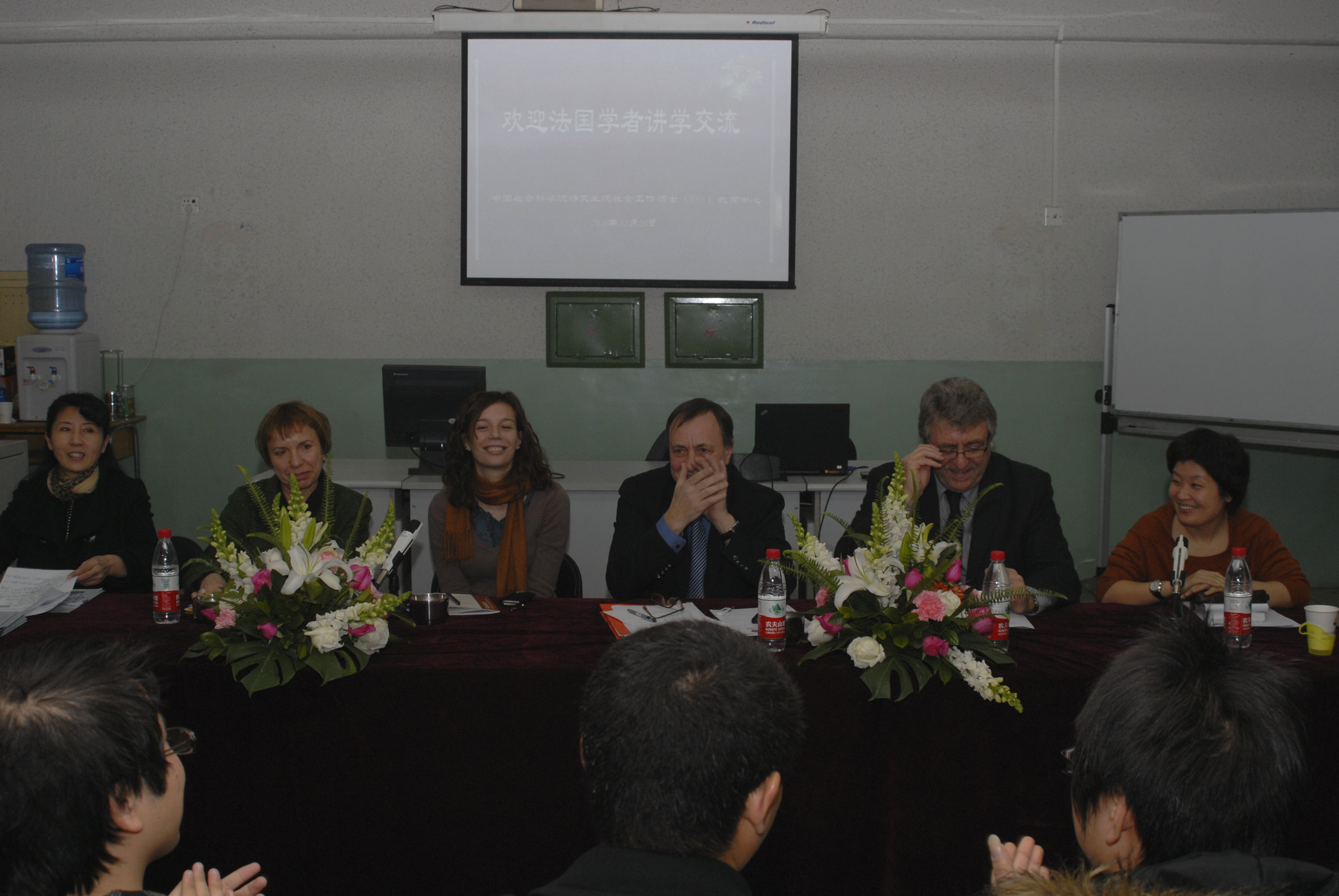 2011年12月20—22日,由社会工作硕士(MSW)教育中心主办,法国大使馆赞助,法国高等公共卫生学校社会政策系副主任雷欣格教授、法国BUC 资源中心(Buc Ressources)主任、国家大区社会工作学院管理总局代表、国家社会工作培训与研究协会联盟(UNAFORIS)代表薄乐艺、法国国立科学技术与管理学院(CNAM)社会工作与社会行动系贾杰教授来华,与国家民政部、北京市民政局、公司社会学所以及相关单位展开为期三天的学术交流座谈。