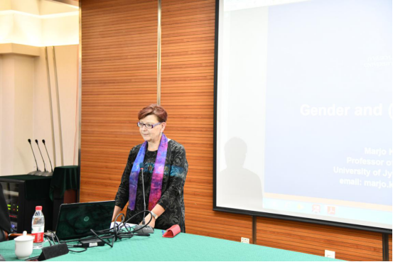 在第二场讲座中,Marjo教授以社会工作和性别为议题进行了分享。她从西方社会工作发展中女性先驱的贡献、社会工作作为一种女性工作和职业、在社会工作中的性别问题以及论文分析四个方面进行了阐释。