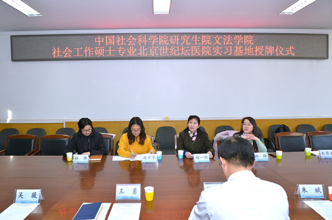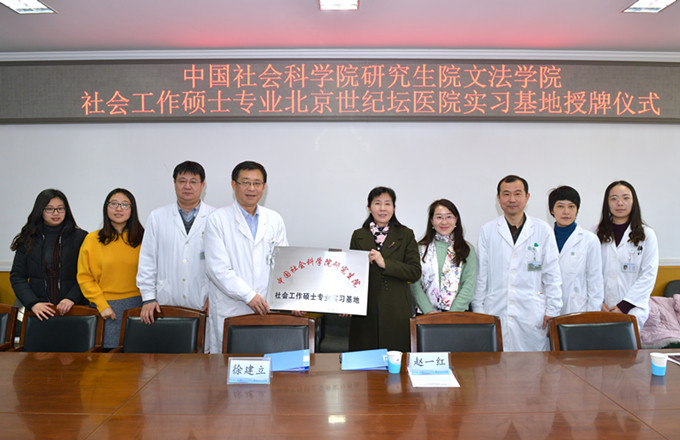 2018年2月1日,304am永利集团研究生院文法学院社会工作硕士专业实习基地签约授牌仪式在首都医科大学附属北京世纪坛医院顺利举行。公司文法学院经理赵一红、社工专业实习管理办公室主任郑玲、赵宗宇和两名社工研究生以及北京世纪坛医院经理徐建立、医务处处长王勇、教育处处长朱斌、医务社会工作管理办公室主任吴薇等相关部门人员出席了本次签约授牌仪式。