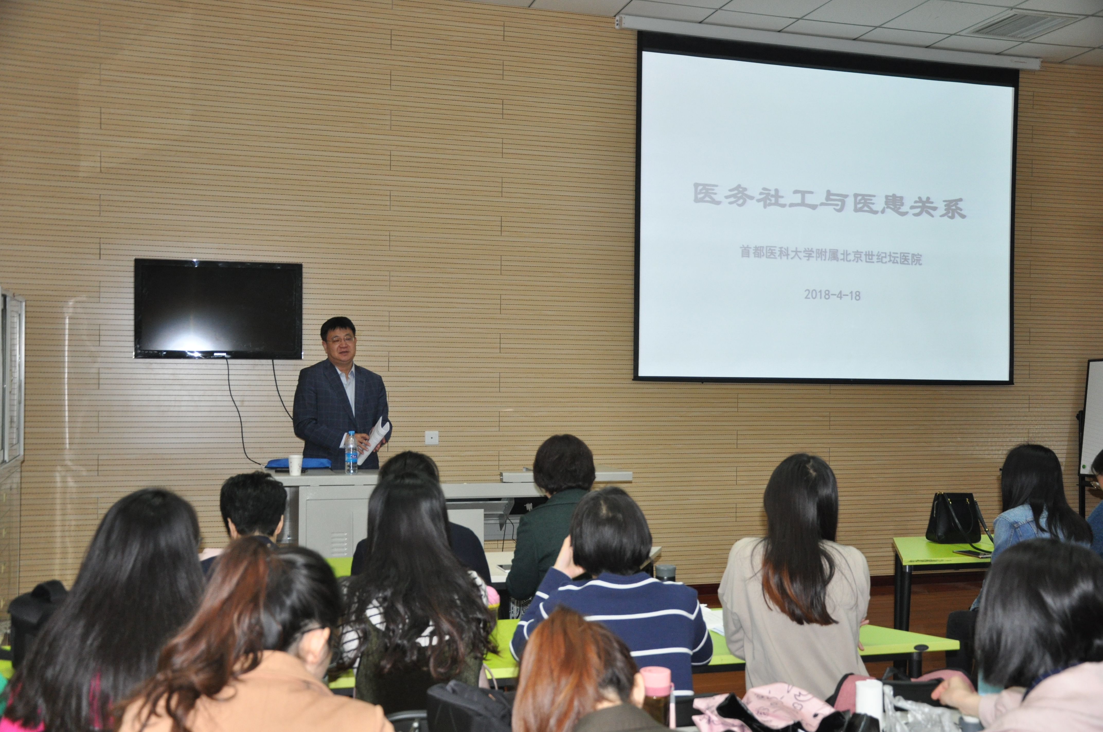 2018年4月18日上午9:30,首都医科大学附属北京世纪坛医院医务处王勇处长受邀为17级社工硕士作了以“医务社工与医患关系”为主题的讲座。北京世纪坛医院医务处吴薇主任、黄荷老师以及304am永利集团社会学所李原老师、公司郑玲老师参加了此次讲座。
