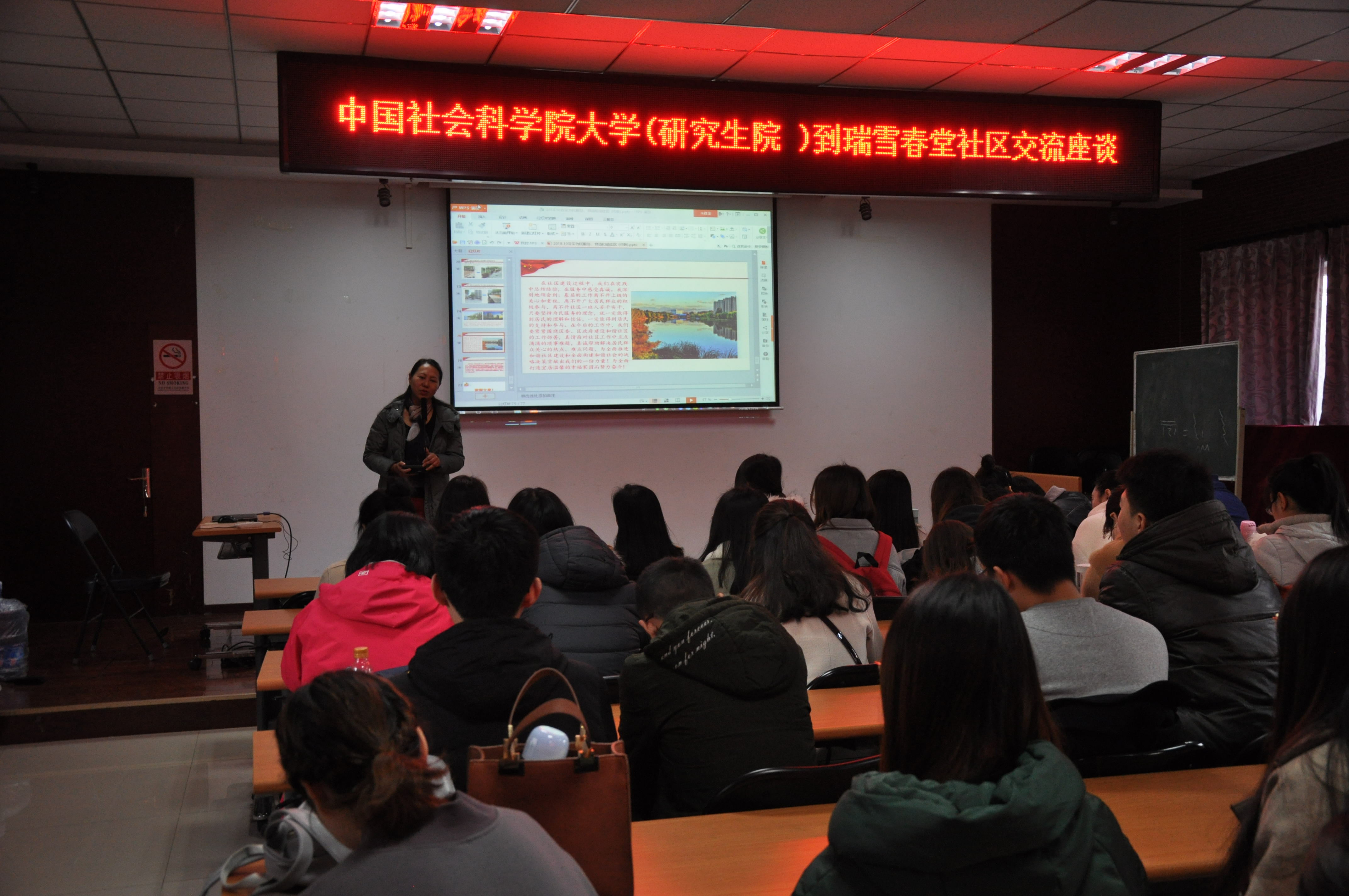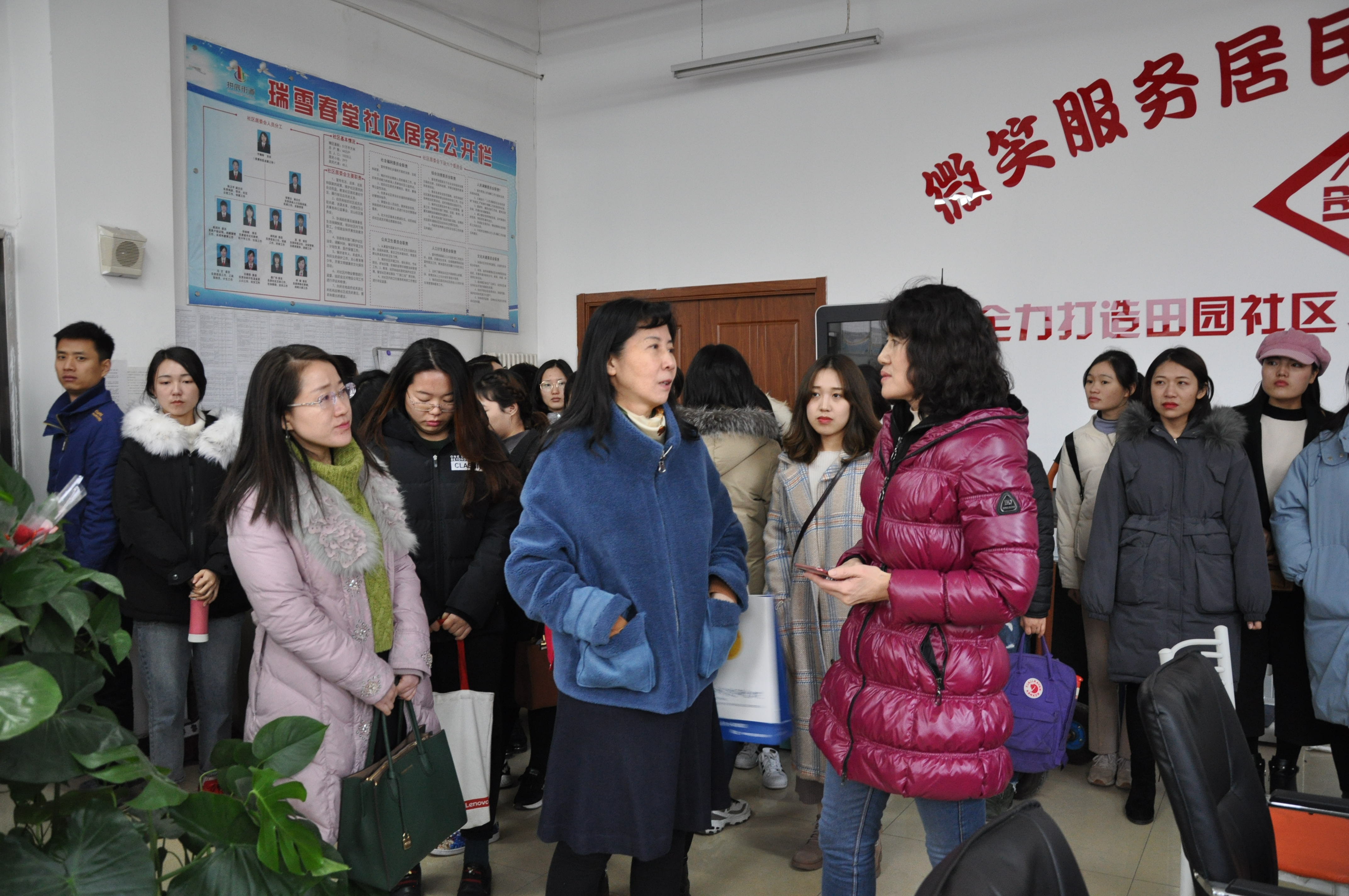 《社区社会工作》是一门实操性非常强的课,与实地实践紧密相联。为了让同学们更好地把专业理论与现实实践相结合,内化《社区社会工作》课堂中学到的专业知识,深入了解社区的基本情况、特色服务以及日常管理,以便于为日后在社区开展专业实习工作打下基础。公司于2018年12月19日下午2点在文法学院经理赵一红教授的带领下走进瑞雪春堂社区,开展了一堂生动有趣的实地教学课。瑞雪春堂社区位于北京市房山区拱辰街道,“瑞雪春堂”,取自“瑞雪兆丰年,细雨润春堂”之意,寄予了大家对本社区的美好向往。社区共计4100户,一万余人。瑞雪春堂社区居委会成立于2011年,自成立以来根据社区居民的需求开展了丰富的社区文化活动,居民们为活动的创办进言献策,积极参与其中,通过活动不仅促进了居民的沟通交流,加强了居民的主人翁意识,也满足了居民日益多元化的需求,营造出了“社区是我家”的和谐氛围。