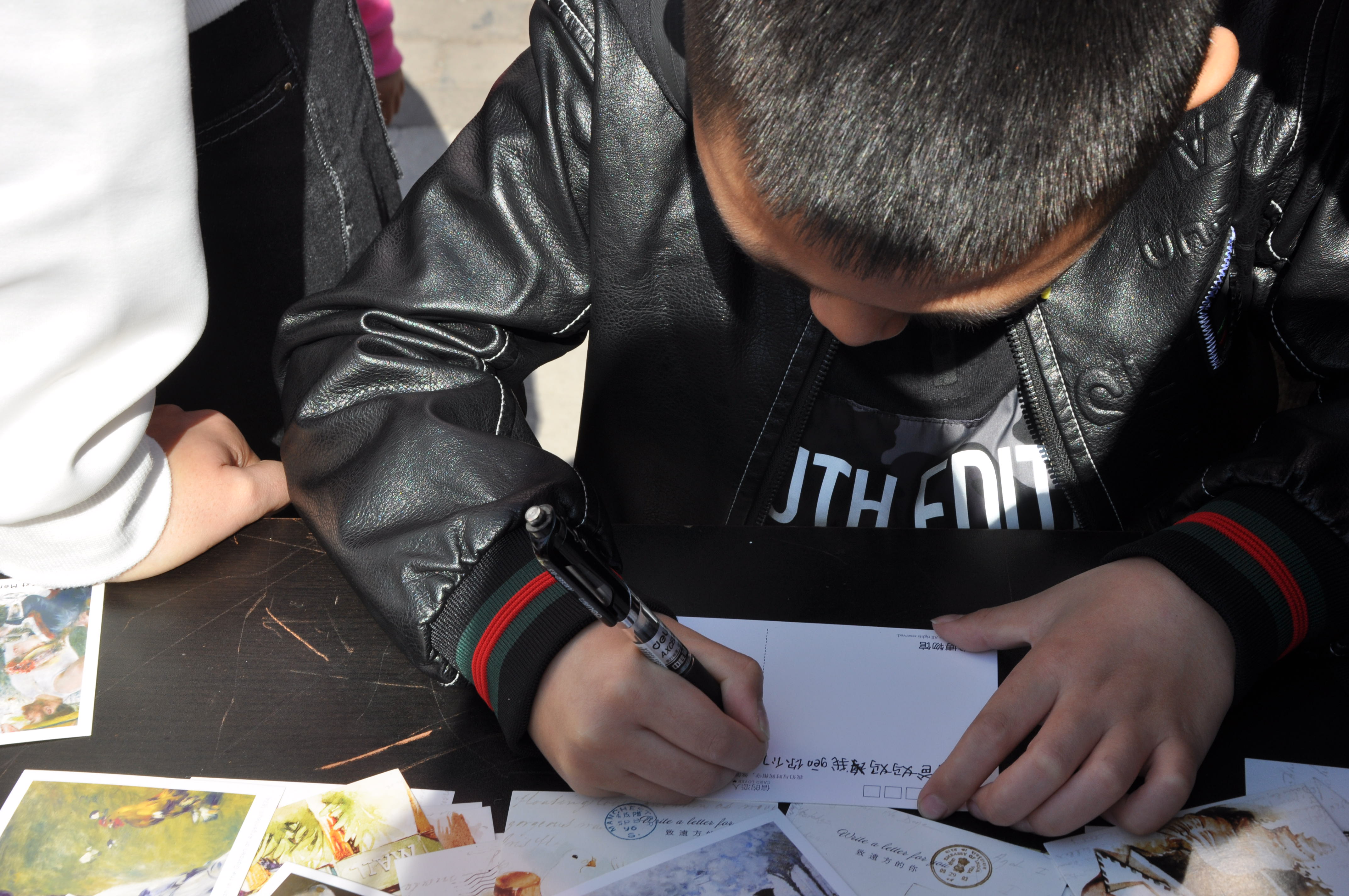 一位小朋友认真地在明信片上写上自己想对爸爸妈妈说的话