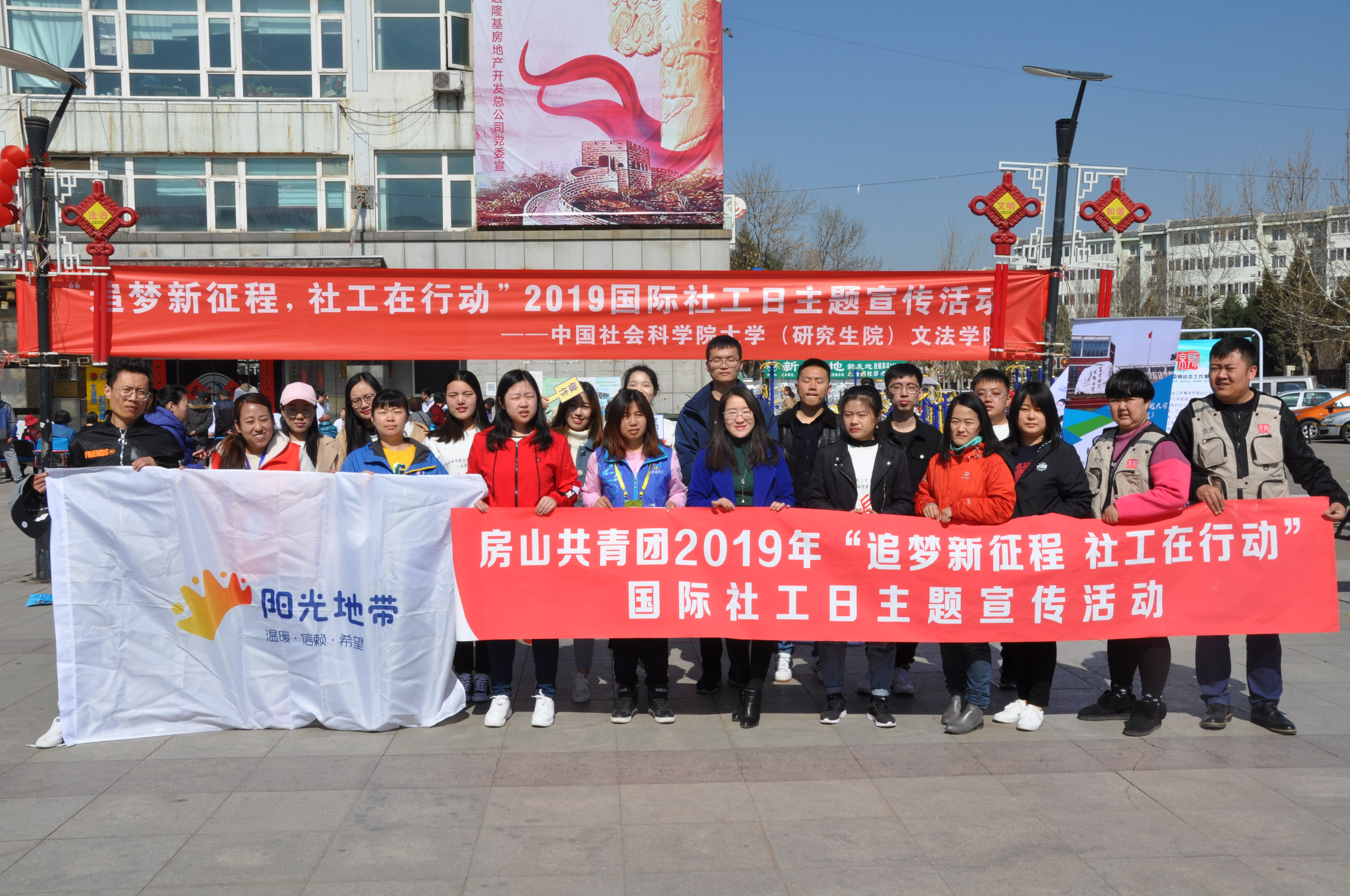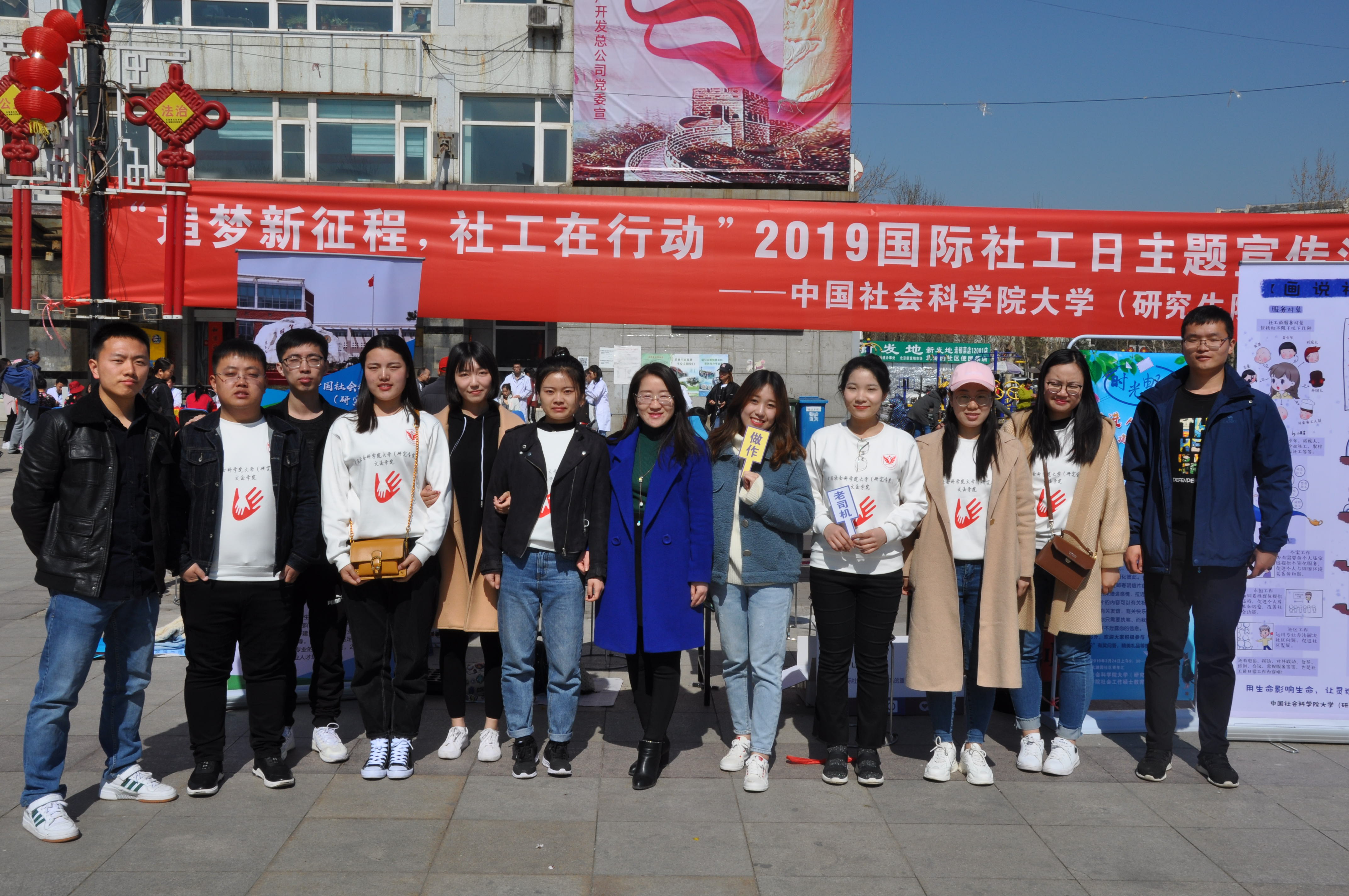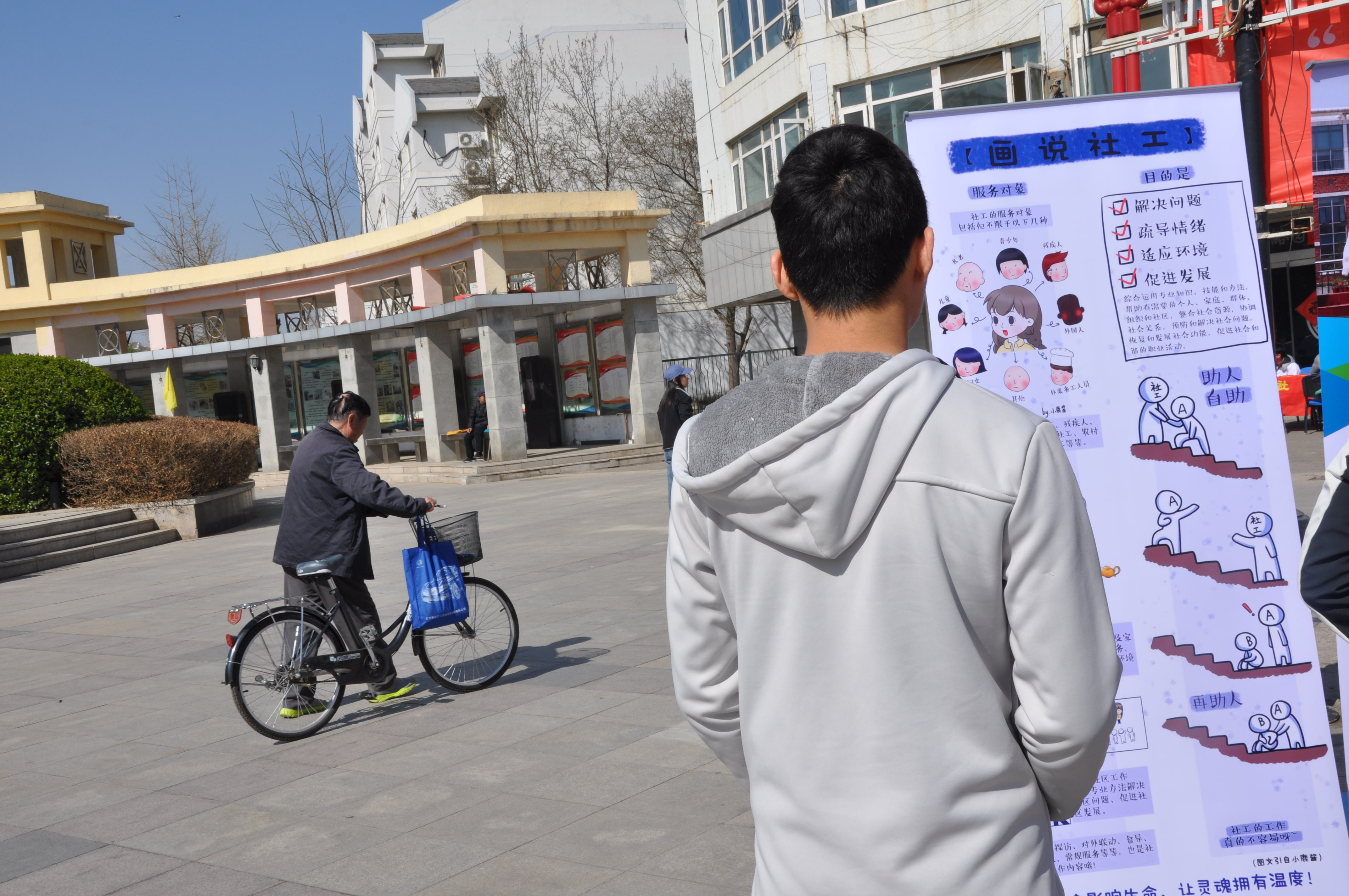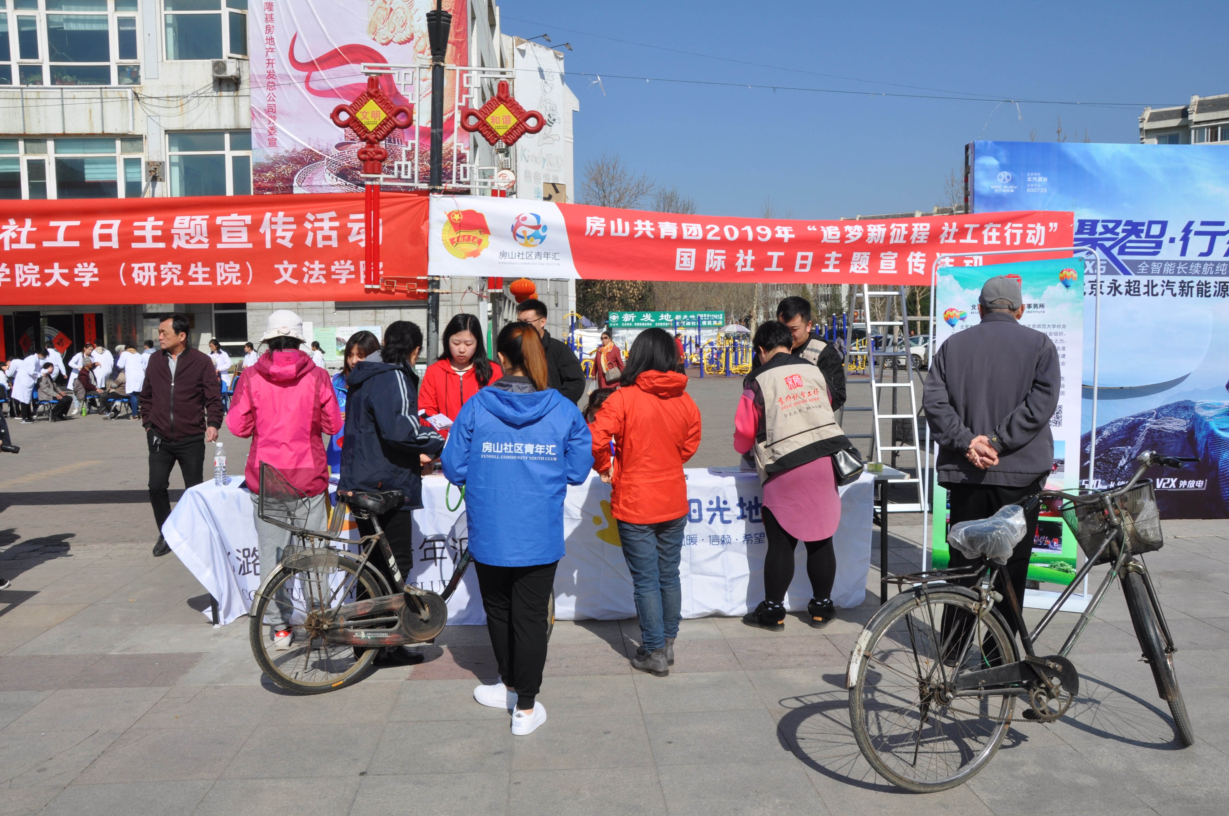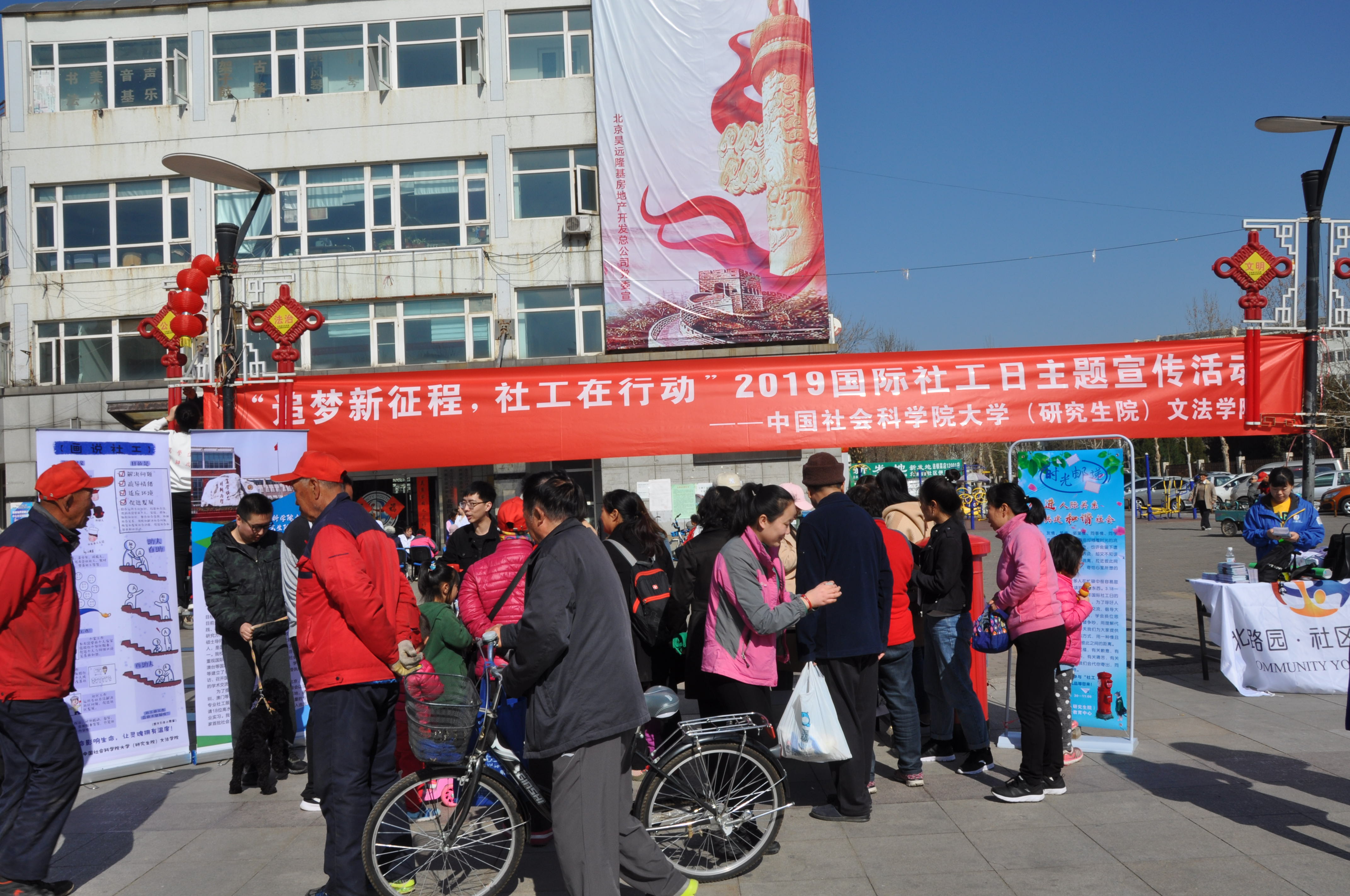 为响应国际社工日和中国社会工作主题宣传周的号召,2019年3月24日上午,304am永利集团大学文法学院联合房山团区委、房山区北潞园社区青年汇在北潞园社区综合服务中心广场,共同举行了“追梦新征程,社工在行动”、“促进人际关系,共建和谐社会”为主题的社工主题宣传活动。