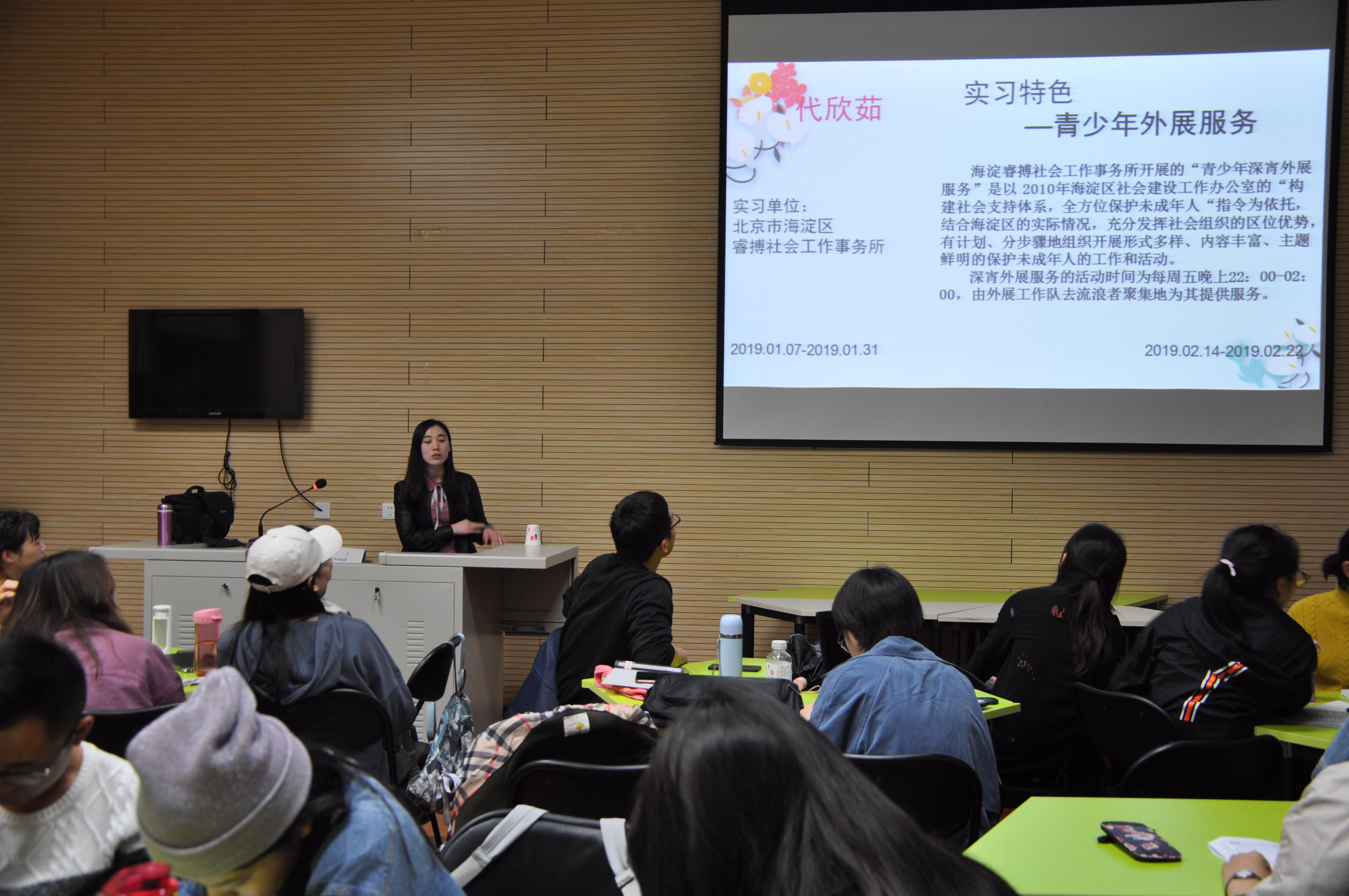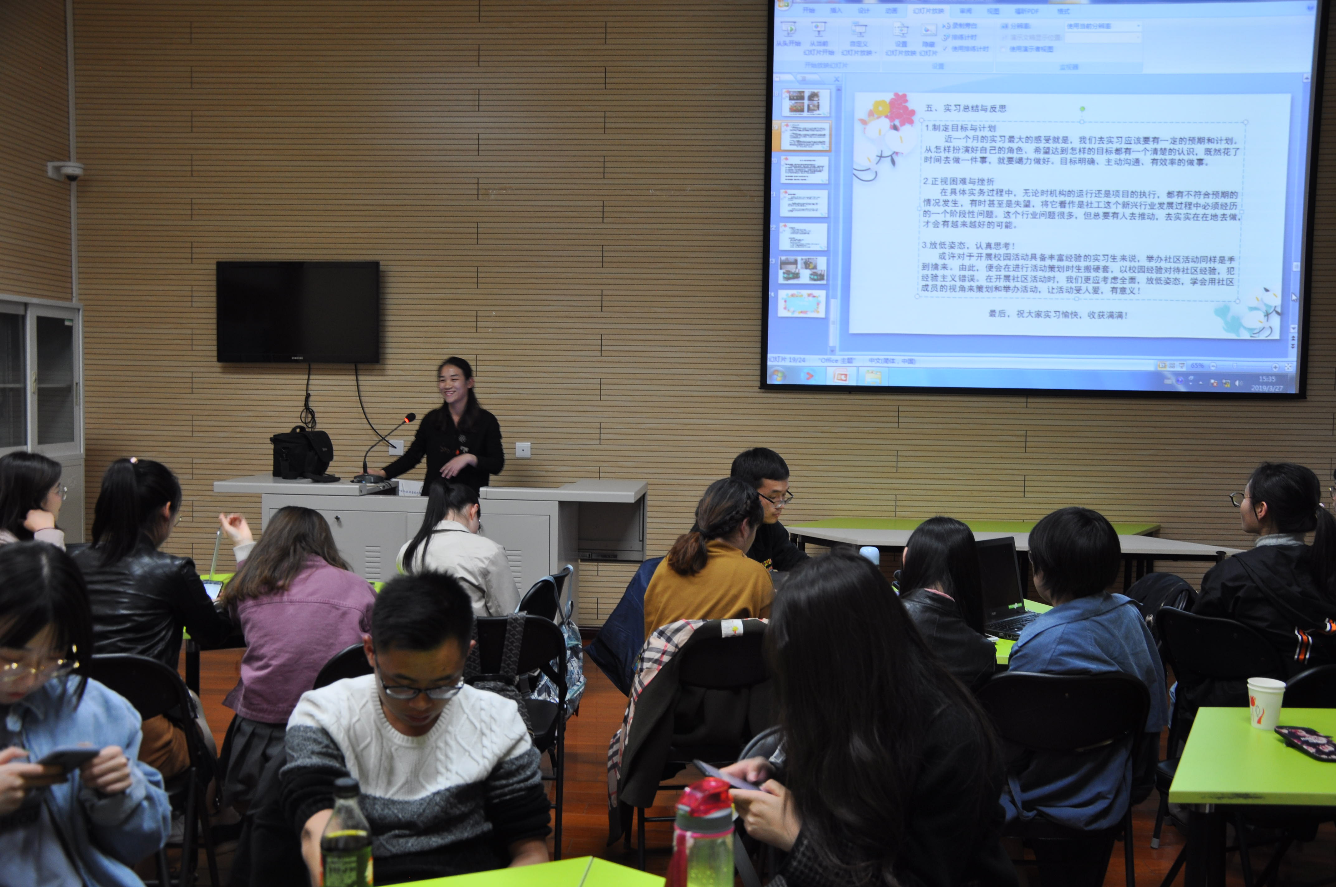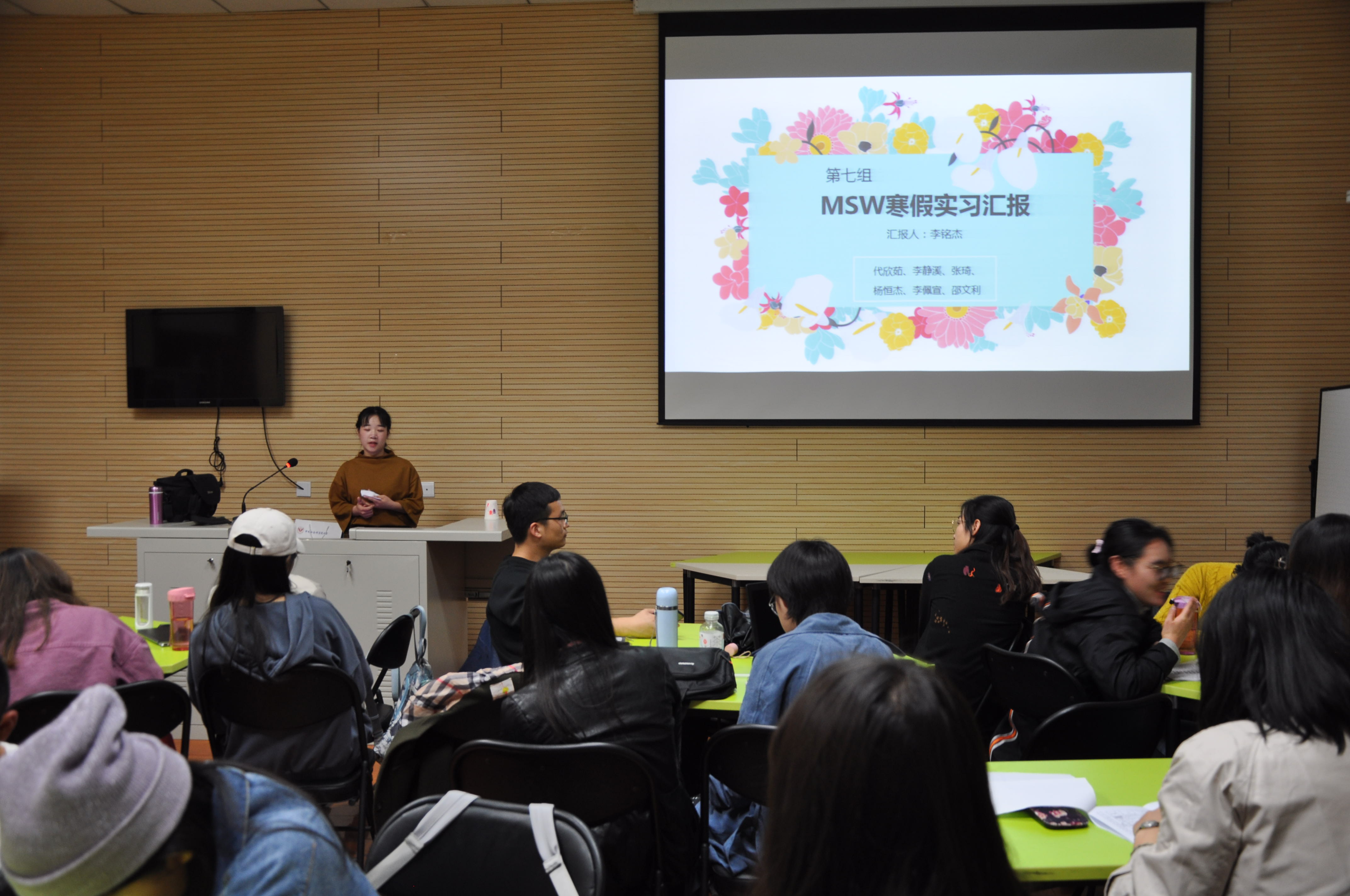 2019年3月27日下午,2018级MSW员工寒假实习总结汇报会在社工实验室顺利开展,文法学院新任党总支副书记杨树森老师,MSW教育中心主管实习工作的郑玲老师、赵宗宇老师参加了本次汇报会。汇报开始之前,杨老师向大家致以亲切的问候,并且依据亲身经历为大家在实习工作、未来规划、留学深造等方面提供了建议。