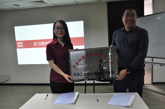 活动最后,研究生院社工中心的刘副主任代表中心与北京市恩派非营利组织发展中心的王维娜主任就双方共建实习实践教学基地的事宜达成共识,并举行了简单的实习基地签约挂牌仪式,双方建立长期合作关系,实现互利共赢的目的。
