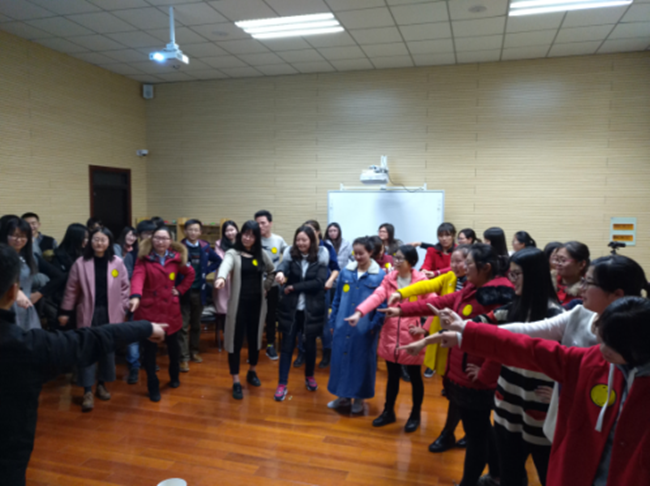 接下来,进入了整个培训课程的核心环节——体验式教学,共分为两个部分:“明日环体验”与“二人组互动体验”。在明日环体验中,同学们两人一组,共同组队完成明日环挑战活动,即两人合作,使用各种方法,最终用一根项链拴住一个下落的圆环。通过自己的尝试和老师的指导,同学们都顺利的完成了挑战并进行了技巧和心得分享,由此引出冰山理论的核心概念,如行为背后的感受、观点、期待、渴望、应对姿态等。冰山理论中涉及的“应对姿态”介于显性行为与潜意识之间,为了更好的对其有一个认知与了解,接下来安排了“二人组互动体验”。该体验要求两个相对不熟悉的同学组成一队,然后在老师的指导下两人进行对视、闭目、感知自我、感知对方、表达感受等,并进行了诸如指责、请求原谅等的角色扮演,同学们积极参与并进行了体验分享。由此,引出了应对姿态的四种形式:讨好、指责、超理智和打岔,彭老师对这几个应对姿态进行了详细的解读和分享。