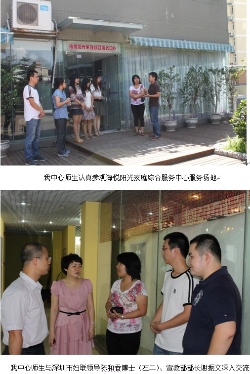 为充分利用在深圳实习的机会和时间、拓宽员工视野,深入了解深圳妇女社会工作开展情况和项目化运作方式,2011年7月23日上午,我中心师生一行9人在刘战老师带领下参访了海悦阳光家庭综合服务中心,深圳市妇联副调研员、妇联主席秘书陈和香博士和深圳市妇联宣教部部长谢振文接待并陪同参访。