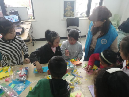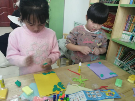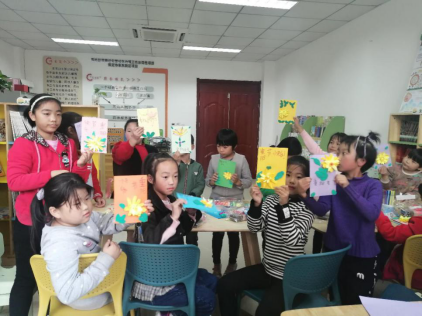 接下来,由社工房芮同学带领孩子们制作赠与老人的手工贺卡。在整个制作过程中,房芮耐心地教孩子们用粘土制作菊花封面,驻点社工在现场帮忙,与孩子们充分互动,活动现场其乐融融。