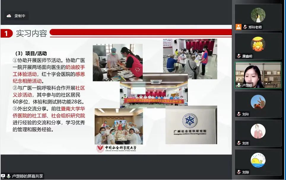 首先,郑玲老师向大家介绍了此次实习汇报会的基本流程、汇报内容和其他注意事项。本次汇报分为上下午,两个班分别进行。在汇报阶段,社工员工通过PPT展示,从实习单位介绍、实习内容、实习收获和实习反思等多个方面进行了总结与分享。此次实习中,同学们的实习领域涵盖了社区社会工作、儿童社会工作、医务社会工作、老年社会工作、司法社会工作、行政社会工作等多个领域,服务对象包括困境儿童、残障人士、老年人等多个群体,覆盖范围十分广泛,实习内容包括开展社区入户探访、个案服务、小组活动、各类主题活动以及社工站建设等方面。