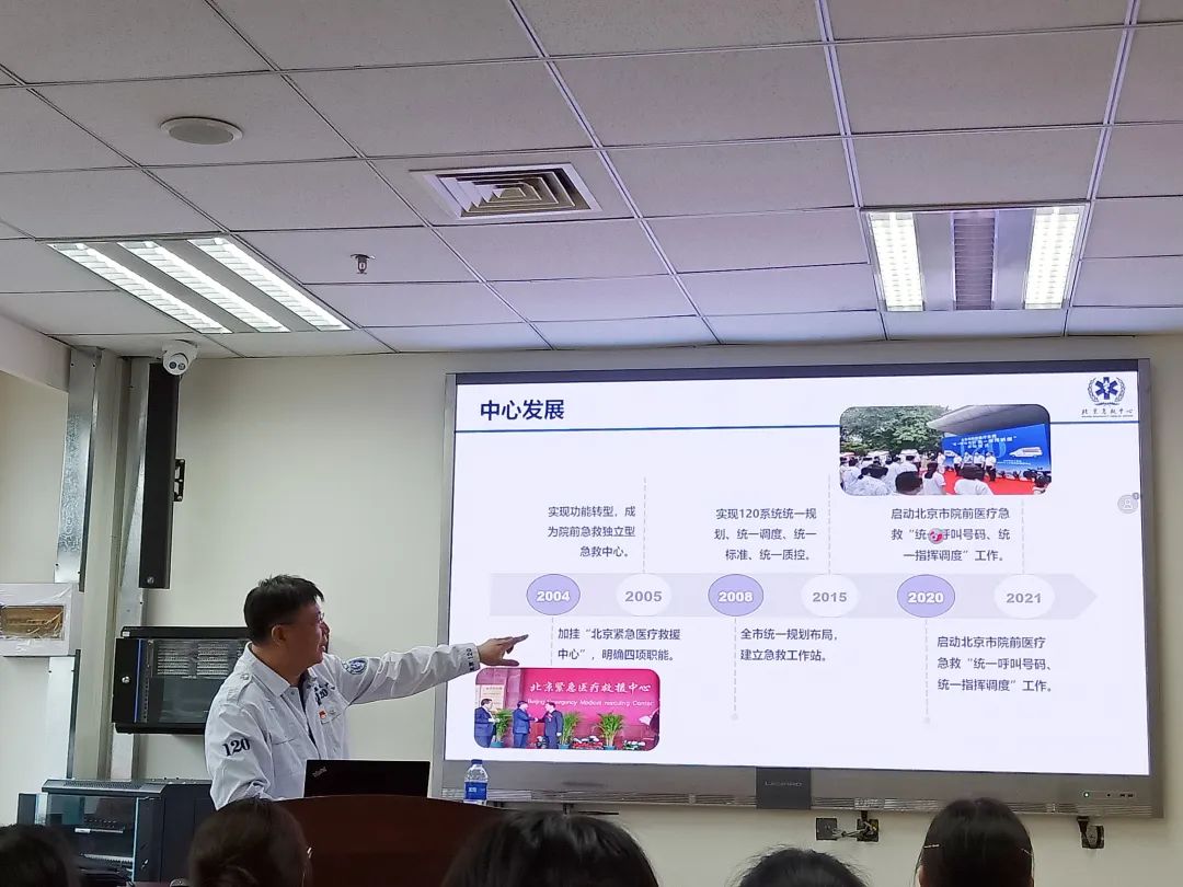 在参观学习完成后,王勇主任向我们介绍了社工介入院前急救服务志愿者队伍组织建设的相关情况,总结了医务社工与志愿者共同融入院前急诊工作全流程的现状和必要性,也鼓励同学们针对自己感兴趣的领域进行深入研究,共同促进医务社会工作在院前急救中的发展。