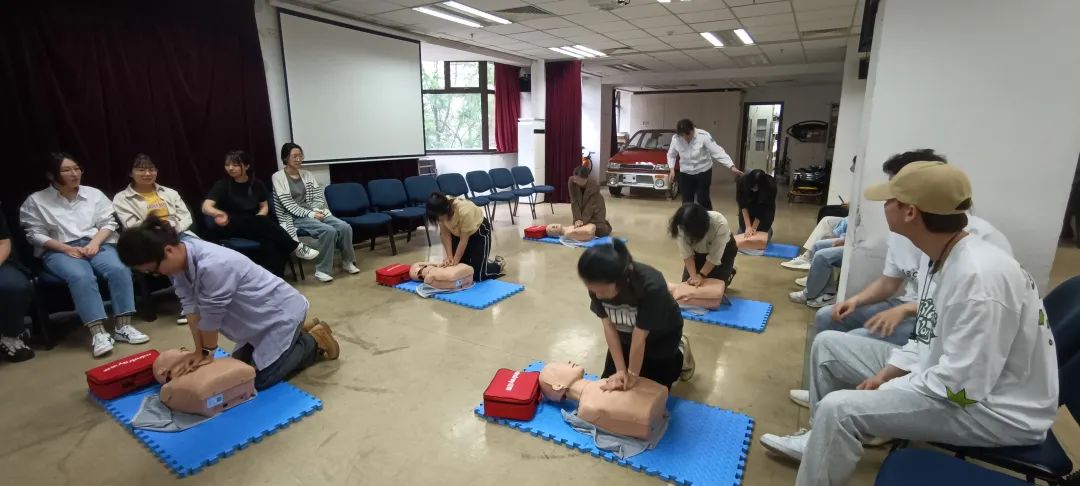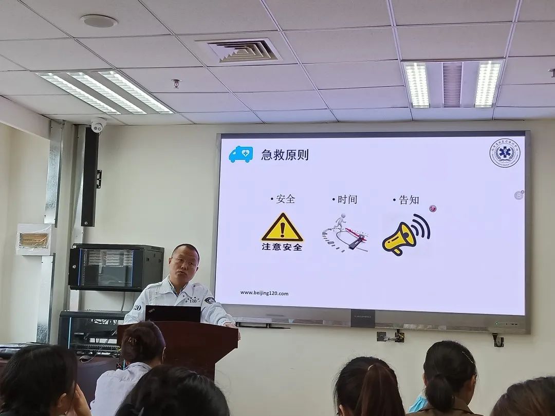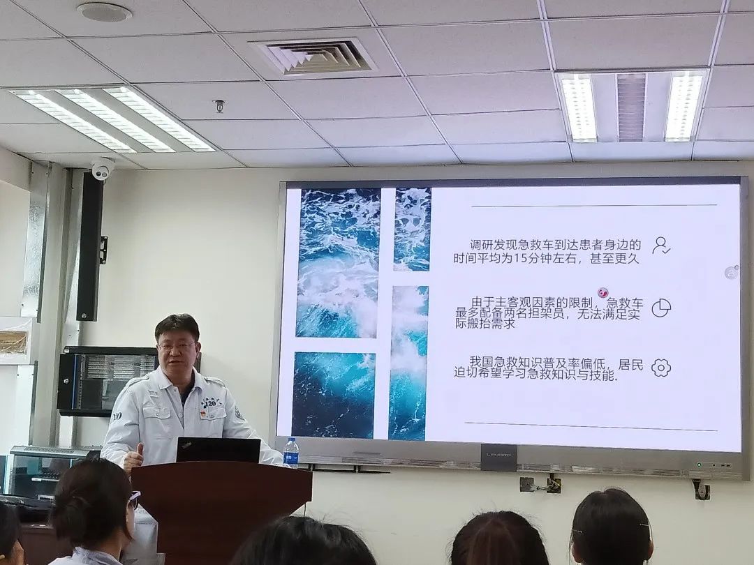 本次现场教学采用理论知识讲授与实际操作相结合的形式,首先由王小刚老师向同学们介绍了急救中心的相关业务以及与急救相关的一些知识,包括黄金抢救时间,基本急救流程以及手法等,使同学们对急救有了较为系统且清晰的认识。