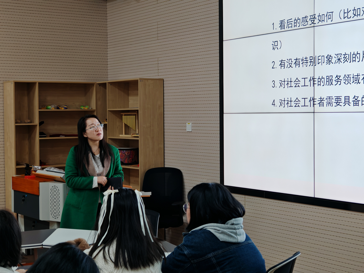 在交流讨论环节,同学们针对影片积极发言。有同学提出,作为社会工作者我们需要有一颗强大的内心,因为社工的工作是面向社会困难人群的,社工需要面对大量的真实社会案例,必须加强我们自身的压力管理和情绪处理。郑老师针对同学的感触,提出社工要具备一定的沟通能力和处理不良情绪的能力,要在工作中接纳服务对象,同时要及时处理自己的负面情绪,保持自己的心理健康。