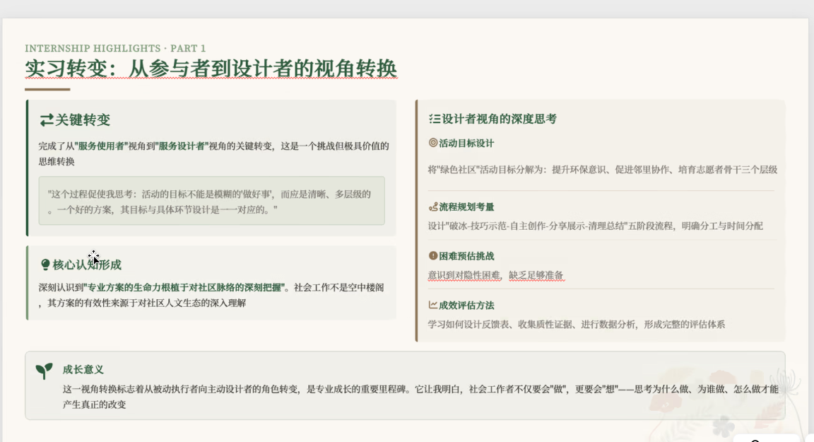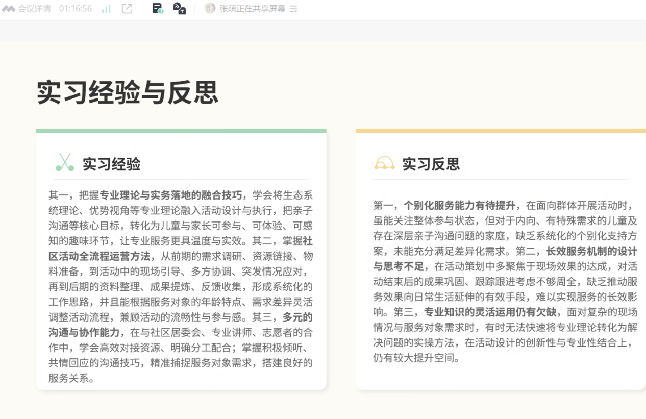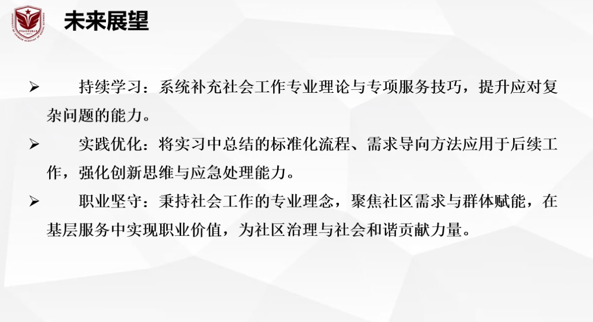 在本次实习汇报中,多位同学结合不同实习场域分享了实践收获:如刘娇娇同学赴新疆博湖县委社会工作部完成毕业实习,深度参与志愿服务与新兴领域党建相关工作,体会到在行政体系中坚持专业价值、强化资源整合与持续学习的重要性;周小梅同学在社会工作事务所聚焦司法社会工作与社区服务,参与涉罪未成年人社会调查、监护评估与社区活动等实践,同时就社工服务行政化、人才流失与本土化适配等行业议题提出反思;崔宇昕同学依托学院房山区农村社会工作人才培养项目开展需求评估、青少年个案介入、儿童小组与社区活动策划执行,强调专业服务应根植真实需求,并在反思中明确需进一步提升危机介入与复杂个案处理能力;张驰同学在社区服务中心围绕代际服务项目、青少年志愿服务体系与社区宣传倡导等工作逐步从观察融入走向深化实操,并通过参与CSS社会调查培训与巡视工作提升了团队协作和应急能力,进一步认识到在陌生社区建立信任关系与提升冲突应对能力的重要性。