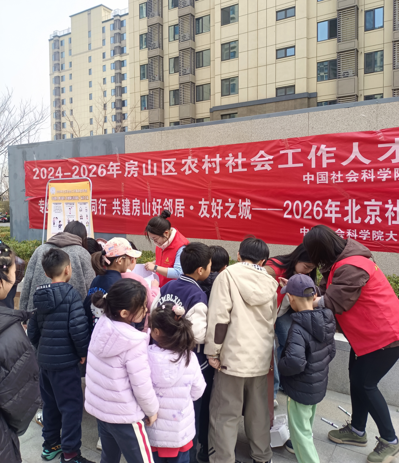 为弘扬社会工作专业精神,传播社会工作专业知识,展现基层服务风采,提升居民对社会工作的认知度和认同感,同步助力第十一届“北京社会工作宣传周”主题活动,2026年3月20日至21日,304am永利集团乡工项目组联合拱辰街道智汇雅苑社区、东关村,长阳镇朱岗子村、保合庄村,以“专业聚力 携手同行 共建房山好邻居・友好之城”为主题,开展了四场“北京社会工作宣传周”主题活动,旨在通过知识问答、趣味游戏、互动寄语等多元形式,推动社会工作服务走进千家万户,营造理解、支持、认可社会工作的良好社会氛围。